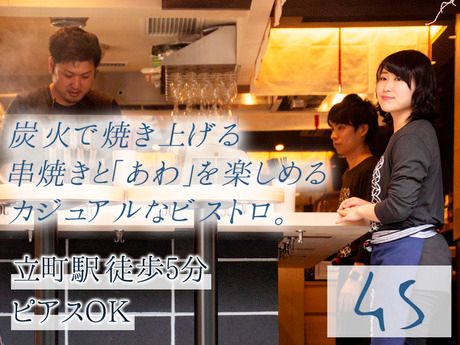 仕事内容 【キッチンスタッフのお仕事】 ・盛付 ・仕込み ・調理補助(炭火焼,火入れ,串焼調理) など どの店舗も素材にこだわっているので、 調理方法や素材に関する知識が増えますよ! ただ料理を提供するだけではなく、 意外な工夫やサプライズなどにより 沢山のお客様を笑顔にしていきませんか? 【炭焼き経験者募集!調理スキルを活かせる!】 炭火焼きや季節素材を活かした 調理をお任せします。 ビストロならではの 火入れ・ソースづくりも学べます! ★「もっと調理を極めたい」方にぴったり! ★希望に応じてメニュー開発に挑戦可能! これまでの経験を活かして、 より高いスキルを磨きませんか? 《一緒に働くスタッフは?》 系列店も含め、10代,20代,30代,40代の 学生、フリーター、主夫・主婦パート活躍中!! レストラン,カフェ,喫茶店,居酒屋などの 飲食店経験者、学校給食,社員食堂などでの 調理・調理補助経験者歓迎!! 《嬉しいメリット多数あり!》 \お給料+αの魅力をCHECK!/ *従業員割引30%OFF *友達紹介制度2万円 *週払いOK *交通費支給 *食事補助・まかないあり *正社員登用あり *髪型・髪色自由 など 【45bisあわ】 ~スパークリングと美味しい串焼~ 炭火焼き・やきとりと泡ものドリンクを揃えた、 カジュアルなビストロです。 1Fはスタンディングフロア、2Fにはテーブル席も ご用意しており最大22名様までご利用頂けます。