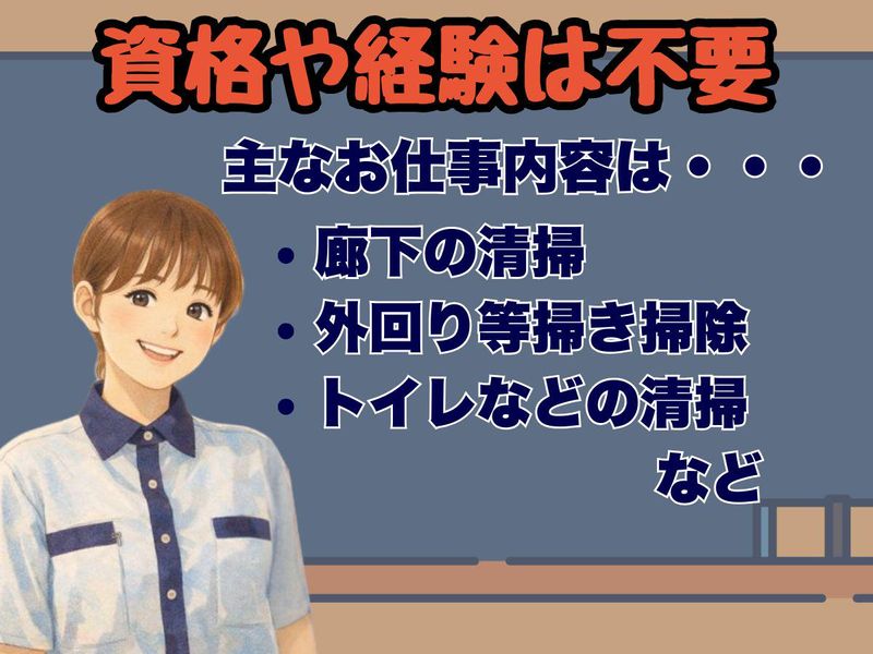 仕事内容 学校用務のお仕事 具体的には・・・ ・来客対応 ・校内の清掃 ・花壇のお手入れ など。 特別な知識や経験がなくても日常的な業務となります。 担当社員や先輩が丁寧にサポートしますのでご安心下さい。 清掃経験のある方は、 清掃経験を活かして働いていただけますので大歓迎。 子供達や地域の方々にとって必要不可欠な学校を綺麗に保つ 為にかけがえのない地域貢献度高いお仕事です。 ゆくゆくは、現場の責任者として学校と担当社員との懸け橋としての 役目も果たして頂きます。