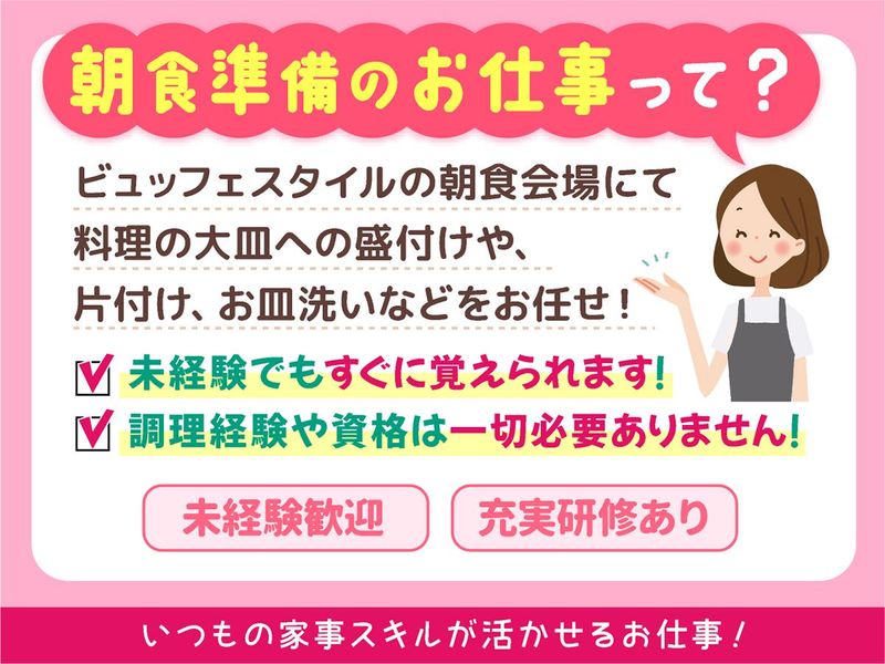 仕事内容 \東横INN 千葉駅東口/ 新規スタッフ採用スタート! セルフサービスの朝食会場にて、 簡単な朝食準備や大皿への料理盛付け、 片付けなどをお任せします! お仕事に慣れてきたら、 「このメニューは人気だから定番にする?」 なんて会話をしながら楽しくお仕事してますよ! 直接お客様から 「美味しかったよ!ごちそうさま~!」 と声をかけて頂けることが嬉しい瞬間! 調理経験や資格は問いません。 簡単な朝食準備や盛付けがメインなので、 未経験の方でも安心して始められるお仕事です。 ◎早朝手当1日150円支給 ◎自転車通勤手当100円支給(規定有)