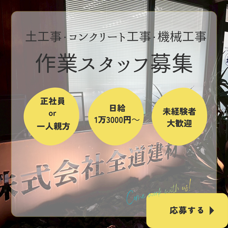 求めている人材 ✅必須or歓迎条件  ̄ ̄ ̄ ̄ ̄ ̄ ̄ ̄ ̄ ̄ ̄ ̄ ̄ ̄ ̄ 【必須】 ・屋外での作業に抵抗のない方 【歓迎】 ・普通運転免許をお持ちの方 ・建設業界での実務経験がある方 ・技能講習、特別教育、免許がある方 ⏩未経験者、大歓迎です! 学歴や経験は問いません。 ⭐建設業で活かせる免許、特別講習、 技能講習の資格をお持ちの方は優遇します。 ✅求める人物像  ̄ ̄ ̄ ̄ ̄ ̄ ̄ ̄ ̄ ̄ ̄ ̄ ̄ ̄ ̄ ・未経験から建設業界に挑戦したい方 ・チームで協力しながら仕事を進めるのが好きな方 ・体を動かす仕事が好きな方 ・一生モノのスキルや資格を身に付けたい方 ・責任感を持って前向きに仕事に取り組める方 ✅こんな方にオススメ  ̄ ̄ ̄ ̄ ̄ ̄ ̄ ̄ ̄ ̄ ̄ ̄ ̄ ̄ ̄ ・安定した会社で腰を据えて長く働きたい方 ・新しい環境で、新生活を始めたい方 (寮完備) ・将来のために、着実にスキルアップ・ キャリアアップしたい方