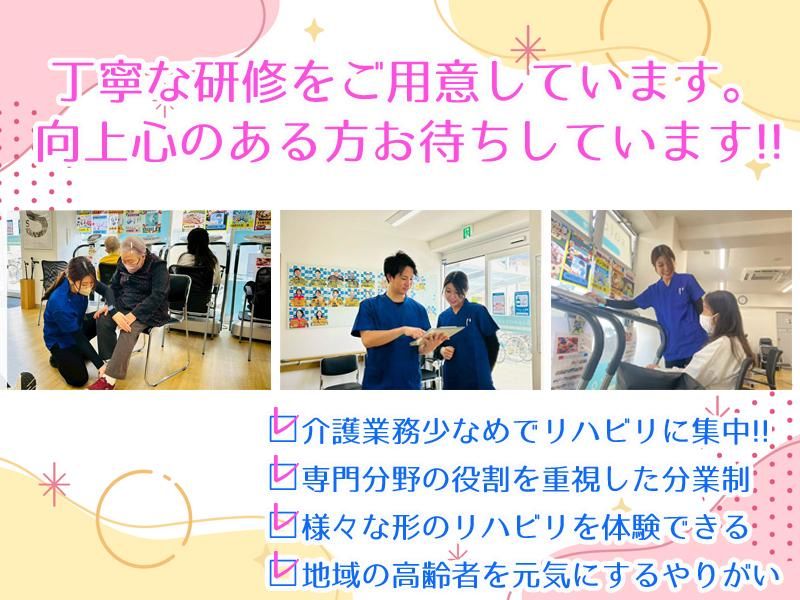 求めている人材 【必須】 ・PC操作スキル(個別機能訓練計画書の作成) 下記いずれかの資格 ・理学療法士(PT) ・作業療法士(OT) ・柔道整復師 ※デイサービスでの機能訓練指導員経験は問いません 【歓迎】 ・スキルが浅い方・未経験の方も大歓迎 ・新卒・第二新卒も歓迎 ・ブランクのある方も歓迎 ・向上心があり前向きな方 ・世話好きな方 ・チームワークを大切にできる方 ・謙虚さがあり周りの方への感謝を忘れない方
