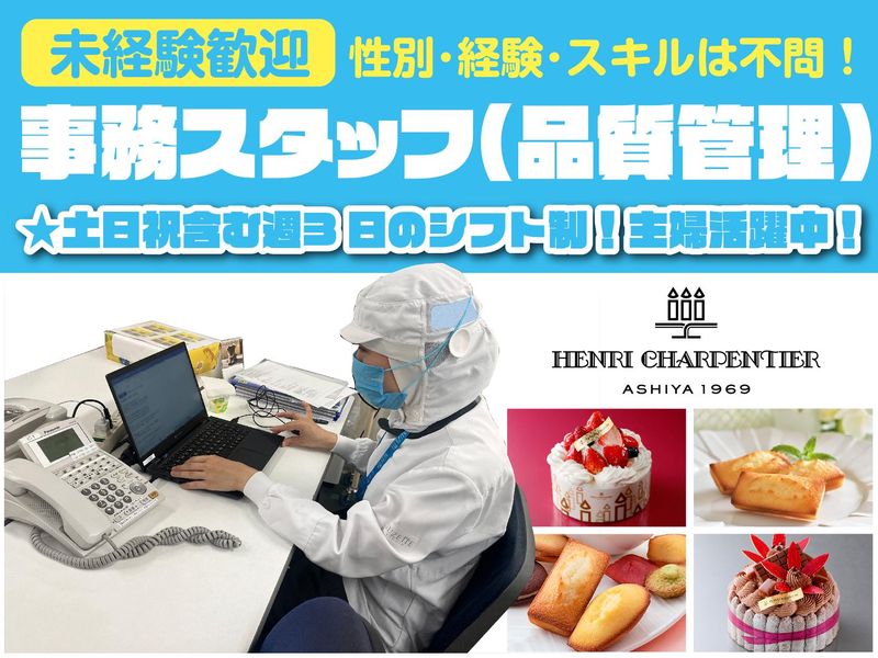 仕事内容 「ケーキや焼菓子の品質管理に関する事務作業」 ・パソコンでのデータ入力作業 ・書類整理などの事務作業 ・分析装置を使った製品の測定、検査の補助 (専用機械に製品を通して、異常が無いかを確認する検査補助です) ✅難しい作業ではありませんので、はじめての方でもスグに慣れて頂けると思います! ✅未経験・ブランクのある方も問題なし!まずは簡単な作業から、少しずつお教えします!