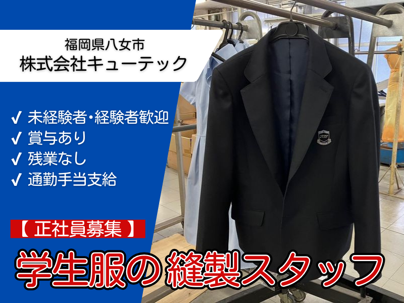 仕事内容 主に学生服(ブレザー等)の製造を行っている会社で縫製作業をお願いします。 ●経験者優遇 ●未経験者は丁寧に指導致しますので、安心してご応募ください。 女子用の学生服(主にブレザー)を製造しています。 30名以上のスタッフがパーツ毎に分かれて分担して作業しています。 担当間の連携も取れており、バックアップ体制は万全! 縫製経験者が経験を活かして活躍できる職場です。 ////////////////////////////////////////// *+ココが注目ポイント+*  ̄ ̄ ̄ ̄ ̄ ̄ ̄ ̄ ̄ ̄ ̄ ̄ ̄ ◆基本的に座り作業! 長時間のお仕事でも安心です。 ◆ブレザーの製造がメインで、 大きな製品はほとんどなく力作業もありません。 ◆屋内での作業になるので、暑い日も寒い日も快適です! ////////////////////////////////////////// 【 株式会社キューテックとは 】 福岡県八女市に本社を置く創業55年を超える学生服製造会社です。 従業員の働きやすさを第一に考え「残業なし」「清潔な職場環境」など 日々、快適な職場づくりを意識しています。 //////////////////////////////////////////
