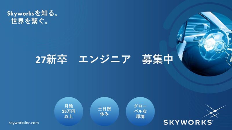 仕事内容 【27卒・理系限定】 SAW・BAW高周波フィルターデバイス 開発・製造エンジニア募集 ━━━ ■ 仕事内容 ━━━ スマートフォンや通信機器に搭載される 高周波フィルターデバイスの開発・製造に携わります。 具体的には、 【開発エンジニア】 ・デバイス構造設計 ・特性評価/解析 ・性能改善のための試作・検証 ・顧客要求仕様への最適化設計 【製造エンジニア】 ・製造プロセス設計 ・歩留まり改善 ・装置条件最適化 ・品質安定化のための工程改善 高周波特性はナノレベルの構造・材料特性・加工精度に左右されます。 専攻で培った理論を、実際の製品に落とし込む仕事です。 ━━━ ■ なぜスカイワークスか ━━━ 当社は高周波フィルター分野に特化したグローバルメーカーです。 ・世界中のスマートフォンに搭載される製品開発 ・高周波領域における専門性の高さ ・外資系ならではのスピード感ある意思決定 ・少数精鋭で若手から裁量を持てる環境 「広く浅く」ではなく、 特定分野で深く戦う技術者を目指せます。 ━━━ ■ 専攻別に活かせる領域 ━━━ ✅ 電気・電子系 ・高周波回路、電磁気学、信号処理 → 設計・評価領域で活躍 ✅ 機械系 ・構造設計、精密加工、装置制御 → プロセス設計・装置最適化で活躍 ✅ 材料系 ・薄膜、結晶、材料特性解析 → 材料選定・特性改善で活躍 ✅ 化学系 ・薬液処理、表面反応、プロセス化学 → 製造工程の安定化・品質向上で活躍 ━━━ ■ キャリアイメージ ━━━ 入社後は製品理解・工程理解を深めながら、 実務を通じて専門性を磨きます。 その後、 ・開発スペシャリスト ・プロセスエンジニア ・海外拠点との技術連携 など、専門特化型のキャリア形成が可能です。 ━━━ ■ オンライン開催! ━━━ このプログラムは、 「自分の専攻 × 半導体メーカーの技術職」 を60分で繋げることを目的にしています。 ■ プログラム内容 ■ スマートフォンや通信機器に欠かせない 高周波フィルターデバイスを題材に 半導体メーカーのモノづくりを 立体的に理解する ✅高周波フィルタが、どの工程で 性能差を生むのか ✅設計・開発・製造が、どう役割分担し 連携しているのか ✅技術者は、何を基準に判断し、 どこで悩むのか ✅大学や研究で学んだ知識が、 製品でどう活かされているのか ※企業説明のみならず 「技術職の考え方・役割」 まで踏み込んでお伝えするプログラムです。 <実施概要> 実施時期:3月中旬~下旬を予定 実施期間:1日(60分) 実施形式:オンライン開催 (Microsoft Teams) ※まずはエントリーをお願いします。 その後、選考についてのご案内を差し上げます。 ━━━━ ■ 会社のご紹介 ━━━━ スカイワークス フィルターソリューションズ ジャパン(株)は、 米国Skyworks Solutions, Inc.の日本法人です。 「Connecting Everyone and Everything, All the time」をスローガンに 、世界中の人々や場所、 そしてモノをつなげるワイヤレスネットワーキングに革命を起こそうと取り組んでいます。 当社の革新的な高性能アナログ半導体は、 世界的な先進企業による画期的な通信プラットフォームを実現し、 私たちの生活や仕事、娯楽、そして学びの在り方までも変えようとしています。 スマートフォン、通信インフラ、車載機器など、 幅広い分野で使われる高性能高周波フィルターモジュールを開発・製造し、 グローバルにソリューションを提供しています。 スカイワークスでは、仲間同士が助け合い、 知識を共有できるチーム環境が整っています。 また、最新の設計ツールや実験室、設備を完備し、 クリエイティブで独創的な思考を大切にする文化が根付いています。 従業員一人ひとりを大切し、 世界中の才能ある従業員が互いへの信頼と尊敬のもとに革新を生み出せる、 そんなダイナミックな職場環境を創り出すべく、日々努力しています。