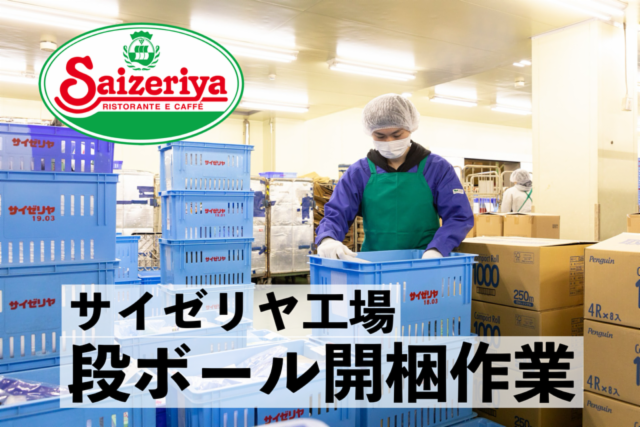 仕事情報 ● 仕事内容 サイゼリヤの工場で、店舗に配送する食材や備品の仕分け、入荷 した原料の開梱、使用容器の洗浄といった作業を担当いただきま す。簡単作業で未経験の方もすぐに覚えることができます。働き 方は短時間からフルタイムまで選択可能。都合に合わせて働ける ので、無理をすることなく長続きします。 物流に興味がある方歓迎 作業は工程を覚えてしまえば、誰でも効率よく進めることができ ます。スピード向上のために、自分なりのアイディアが活かせる のもこの仕事の楽しみの一つ。コツコツと集中できる作業が好き な方のご応募大歓迎!働きながら物流のしくみやノウハウを身に つけることができるので、業界に興味のある方もぜひ。 働きやすい福利厚生 制服貸与や有給休暇制度、社会保険完備など、働きやすい福利厚 生が充実。また、休憩室では、冷蔵庫や電子レンジといった設備 に加え、お茶とコーヒーを無料で提供いたします。交通費は全額 支給しており、自転車通勤の場合も規定を満たせば支給の対象で す。車通勤も可能なので、ご希望の方はご相談ください。 サイゼリヤのこだわり イタリア料理の精神である素材を活かしたシンプルな調理こそが 、毎日食べても飽きることがないおいしい料理であると考えるサ イゼリヤ。本場イタリアメーカーと食材の開発を行い直輸入をす るなど、素材へのこだわりを強く持っています。安全かつおいし い、健康にもよいサイゼリヤのお料理に携わってみませんか。 スタッフの声 40代主婦です。初めは1日4時間の短時間で働いていましたが、子 供が成長したので、社会保険に加入し、フルタイムでしっかり働 いています。半年ごとの契約更新で働き方を相談でき、自分の生 活スタイルに合わせて変更も可能です。体を動かす仕事なので、 日頃の運動不足解消したい方におすすめです。