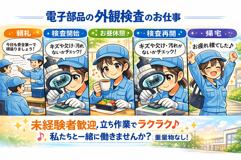 仕事内容: 大手電子部品メーカーでの外観検査業務です。 \とにかくシンプル作業/ 手のひらサイズの軽い電子部品をチェックするお仕事です。 ・キズがないか見る ・欠けがないか確認する これだけ! 目視や拡大鏡を使うので、細かい作業が初めてでも安心です。 ここがポイント♪ ✔ 重い物なし(体力不安でもOK) ✔ モクモク作業(人付き合い少なめ) ✔ 空調完備で年中快適 ✔ 未経験スタート多数