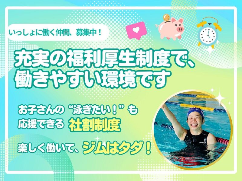 【保険制度】 雇用保険、労災保険、健康保険、厚生年金 待遇・福利厚生 【福利厚生】 ●社会保険完備 ●昇給あり ●交通費規定支給 ●車通勤OK ●家族の方も社割で施設利用可 ●社割アリ ✨無料で併設する スポーツクラブが利用できます。 お風呂やサウナも利用OK!