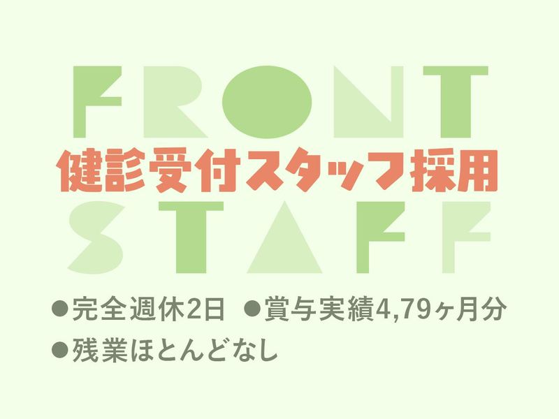 仕事内容 「総合健診センター ヘルチェック」にて、 お客様をお出迎えする受付ポジション! …━━━━━━━━━━━━… 安定の環境で腰を据えて活躍できる! 【働きやすさのPOINT★】 ☆大手グループならではの好環境! ☆充実の研修で未経験も安心 ☆完全週休2日 ☆産育休あり(取得・復帰実績あり) ☆賞与年2回(4.79ヶ月実績) ☆食事代補助あり(1食189円!) ☆転居を伴う転勤なし ・‥…━━━━━━━━☆ \安心の研修体制/ 医療業界の知識から受付業務の仕事の流れ、 接遇やお客様対応のスキルなど 基本となる部分から学べる入社後研修あり! 配属後も頼りになる先輩たちが フォローするので、 あなたの経験に関係なく挑戦可能です! …━━━━━━━━━━━━… 【業務内容】 健診センターでの受付・会計業務を お任せします。 「安心・快適」に健診を 受診していただけるような 丁寧な声掛けをお願いします。 ■お客様の登録内容確認 ┗健康保険組合 ┗保険証などの確認 ┗事業所の契約確認 ■ご案内業務 ┗会計窓口でのご案内・対応 ┗更衣室へのご案内 ┗ロッカーの清掃・翌日準備 「安心・快適」に健診を 受診していただけるような 丁寧な声掛けを心がけています。 …━━━━━━━━━━━━… \社会貢献に繋がるやりがい◎/ 多くの方の健康保持と増進を支える “総合健診センター”は、生活習慣病の予防や 病気の早期発見などに繋がっています。 だからこそ 「人の役に立てる」 「社会・医療業界に貢献できる」 という点はもちろん、 受診者に直接感謝の言葉を いただけることも“やりがい”となります!