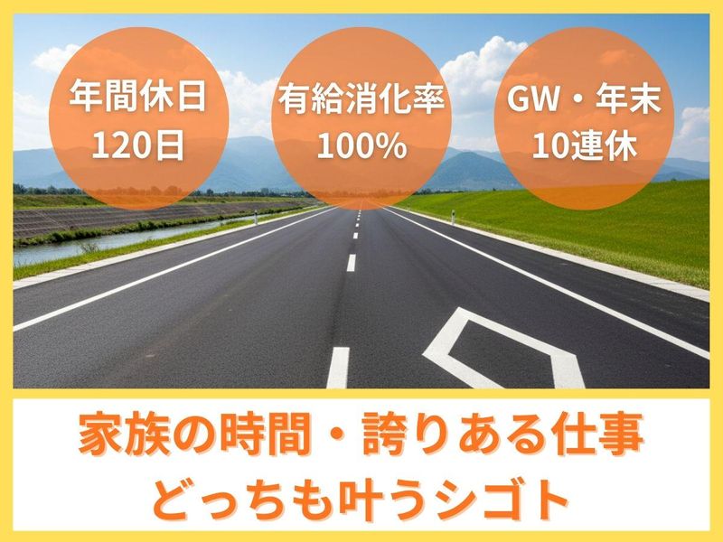 仕事内容 \\求人のPOINT// ┈┈┈┈┈┈┈┈┈┈┈┈ ✅年間休日120日 ✅年収交渉可能です(前職の年収考慮) →初年度年収650万円以上も可 ✅現場はすべて菊陽町内です! ✅有給消化率100%★ ✅1回3万円の昇給実績あり ✅現場直行直帰OK ✅社用車持ち帰りOK(規定) ✅出張・転勤一切なし★ 【具体的な仕事内容】 ┈┈┈┈┈┈┈┈┈┈┈┈ 菊陽町内の公共工事の 土木施工管理をお任せ。 【担当範囲】 ・年間:3〜5件(入替制) ・規模:1,000万〜8,000万円 ・工期:2〜6ヶ月(平均3〜4ヶ月) ・体制:1現場1担当+補助/協力会社と分担 ・残業:月20h以内(工程調整で吸収) ・夜間:なし ・人数:4〜20名目安(規模により変動) ・現場掛け持ち:なし 【1日の流れ(一例)】 ┈┈┈┈┈┈┈┈┈┈┈┈ 08:00 現場朝礼・安全確認 08:30 進捗確認・協力会社と段取り調整 10:00 小休憩 12:00 昼休憩 13:00 出来形確認・写真整理/発注者対応 15:00 小休憩 16:00 撤収・日次報告/定時退社が基本 【会社の特徴】 ┈┈┈┈┈┈┈┈┈┈┈┈ 1976年創業・創業49年の地域密着企業。 菊陽町内限定の土木工事を中心に、 転勤・出張なしの働き方を提供。 ブライト企業認定の安心感と、 定年制なしで長く活躍できる 環境が整っています。 【ブライト企業として選ばれる理由】 ┈┈┈┈┈┈┈┈┈┈┈┈ 当社は熊本県の**「ブライト企業」に 認定された、地域密着の安定企業です。 従業員とその家族の満足度を何より重視し、 地域雇用・地域貢献に継続して取り組み、 堅実な経営基盤で長く安心して働ける 環境を整えています。 ★★★【会社について】★★★ ┈┈┈┈┈┈┈┈┈┈┈┈ 「地元で、無理なく、長く。」を合言葉に 菊陽町のインフラを支える土木施工を展開しています。 全現場を町内に限定し直行直帰と短距離移動で拘束時間を抑え、 週次の工程調整+応援体制で残業ほぼなしを実現。 1現場1担当制と標準化された書類運用で監督は管理に専念できます。 資格取得は会社全額負担、取得後は手当で評価。 夜間工事は原則なしで、安心して長く働ける環境です。