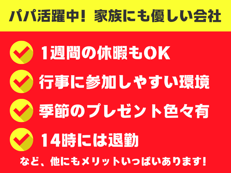 選考プロセス ★ここまでお読みいただき ありがとうございます! 応募を確認後、 担当者よりご連絡させて頂きます。 【応募後の流れ】 1.応募 2.担当者よりご連絡いたします。 3.面接実施 4.内定 お問い合わせだけでも大歓迎! お気軽にご連絡ください◎ ★興味・関心がある方はぜひ 『ブックマーク』ボタンを押して 保存してください。