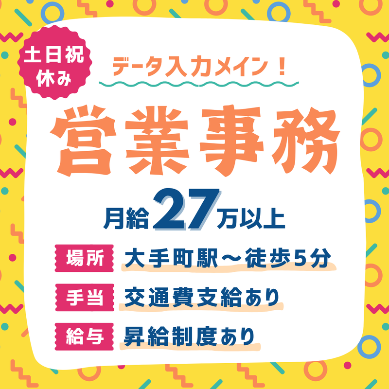 大手町駅/月収27万~/土日祝休み/17:30退勤/即日入社