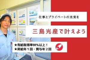 仕事内容 私たち三島光産は、市原市五井に事業所を構え、 創業100年を超える企業です。 今回、大々的に正社員を募集しますので、 会社説明会を行います。 AGCの未来を支えるイノベーション材料を作る 最先端の職場で一緒に働きませんか? ぜひお気軽にご参加下さい。 ◆◆☆☆<<会社説明会>>☆☆◆◆ 創業109年目を迎える老舗企業で 一緒に活躍する仲間を募集します。 今回はなんと、正社員の募集です! まずは私たちを知っていただきたいので、 下記の日程で<<会社説明会>>を開催致します。 「工場ワークの経験がないけど大丈夫・・?」 「どんな仕事なんだろう・・・?」 そんな時はまずお仕事説明会に来て下さい! アナタの不安を解消します!!参加費はもちろん無料☆ あなたのご参加お待ちしております! ◆◆☆☆千葉市会場☆☆◆◆ 日時:2月28日(土) 開催時間:(1)9:30~(60分) 会場:蘇我コミュニティセンター 3階 講習室3 (〒260-0834 千葉市中央区今井1-14-43) (JR内房線、外房線、京葉線「蘇我」駅西口から徒歩5分・ 無料駐車場あり) ◆事前予約のため、下記メールアドレス又はフリーダイヤルに (1)参加日時・会場 (2)お名前 (3)ご連絡先を お送りいただくようお願いします。 (締め切り:開催日の2日前の夕方16時までに メール又はお電話でお申込みをお願いします。) <申込先Eメールアドレス> chiba-business@mishimakosan.com 三島光産 鳥畑 宛 <フリーダイヤル> 0120-20-4351 <仕事内容> AGC千葉工場にてフィルム製造オペレーターをお願いします。 ※他にもたくさんのお仕事を用意しております。 きっとあなたに合うピッタリなお仕事が見つかるはずです。 <今だけ!入社お祝金10万円支給> 事業拡大につき会社を盛り上げてくれる仲間を増やすため 今回初めて入社お祝金を支給することに決定しました。 ぜひ、こちらを転職のため支度金として活用ください。 ※採用人数 (60名限定) に達した段階で終了します。 ※詳細は面接時にお伝えいたします。 <採用担当者より> ハローワークで正社員のお仕事をお探しの方、 製造や工業内作業を希望されている方、ぜひご応募ください。 こちらの求人をご覧いただいている「あなた」と お会いできることを楽しみにしております。