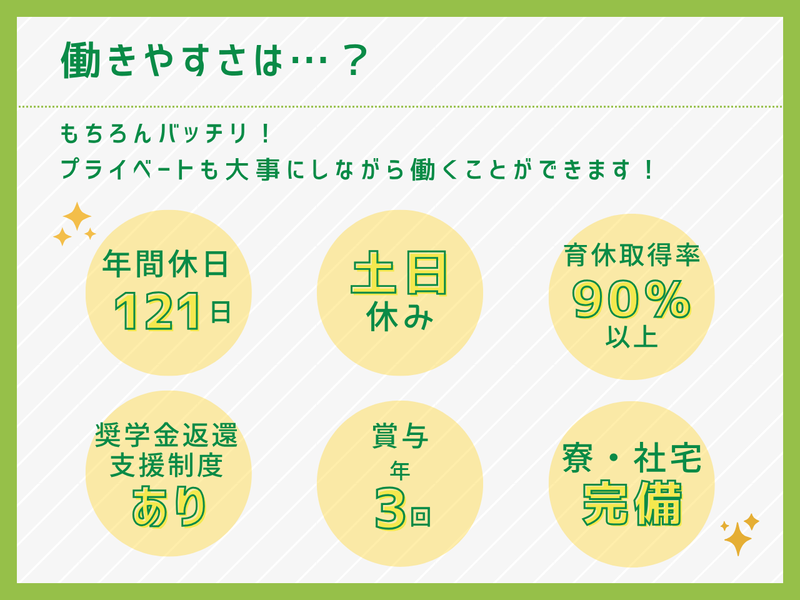 職場環境 ✅県外への転勤なし! ✅マイカー通勤OK&無料駐車場完備◎ ✅男性の育児休暇取得実績あり! ✅寮・社宅完備&住宅手当で生活サポート充実 ✅有給休暇も取得しやすくプライベート充実 ✅和気あいあいとしたコミュニケーション◎