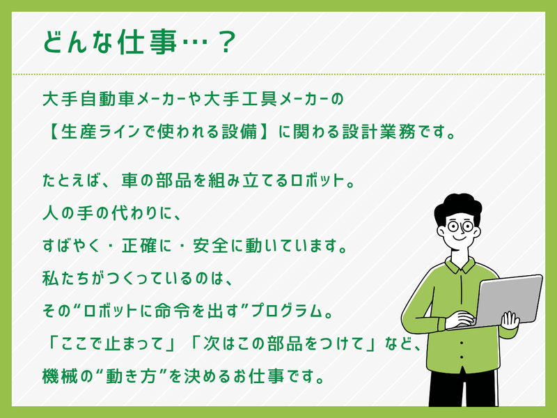 仕事内容 \\あなたのアイデアで、機械が動き出す!// 機械、建築、Web…どんな分野でも構いません。 あなたがこれまで培ってきた「設計」という仕事の面白さを、 今度は「モノを動かす」世界で発揮してみませんか? 私たちがつくっているのは、 工場のロボットに命令を出すプログラム。 いわば、機械の“動き”そのものを設計する仕事です。 電気の知識は、入社後にしっかり学べるのでご安心を。 大切なのは、 「どうすれば効率よく動くか?」を考える論理的な思考力。 それは、あなたが設計の仕事で培ってきた、 最高のスキルのはずです。 これまでの経験を武器に、新しいキャリアへ。 ワクワクする挑戦が、あなたを待っています。 ================== ⭐経験を活かしてキャリアチェンジ! 成長を加速させる研修制度✨ あなたの設計経験を、 電気制御の世界で通用するスキルへと進化させます。 “トヨタ流モノづくり”の考え方も学べる、 当社ならではの研修です。 STEP① あなたの知識と、当社の技術を繋ぐ  ̄ ̄ ̄ ̄ ̄ ̄ ̄ ̄ ̄ ̄ ̄ ̄ ̄ ̄ ̄ ̄ ̄ ̄ ̄ まずは、あなたの持つ設計スキルをヒアリング。 その上で、電気の仕組みや図面の見方など、 この仕事に必要な基礎知識をプラスしていきます! あなたの経験を土台にするので、吸収の速さが違います。 STEP② シミュレーターで、思考をカタチに  ̄ ̄ ̄ ̄ ̄ ̄ ̄ ̄ ̄ ̄ ̄ ̄ ̄ ̄ ̄ ̄ ̄ ̄ ̄ あなたの考えたロジックが、実際に機械を動かす。 その面白さを、失敗を恐れずに何度でも試せます。 分野が違っても「設計したものが動く」感動は共通のはずです✨ STEP③ 先輩と一緒に現場デビュー!  ̄ ̄ ̄ ̄ ̄ ̄ ̄ ̄ ̄ ̄ ̄ ̄ ̄ ̄ ̄ ̄ ̄ ̄ ̄ まずは簡単な設定やチェックからスタート。 隣で見守ってくれる先輩がいるので、心配はいりません。 ================== 【仕事内容】 当社が手がけるのは、 大手自動車メーカーや大手工具メーカーの 【生産ラインで使われる設備】に関わる設計業務です。 ⭐お任せするのは… ・設備内の「配線」や「制御盤」の設計 ・PLC(制御プログラム)の作成 など 《たとえば …》 生産設備には、センサーやモーターなど さまざまな部品が使われています。 それらが正しく動作し、 安全かつ効率よく製品を作れるよう、 設備全体の動作を制御するプログラムを作成します。 「機械が命令通りに動く」あの感覚、 ちょっとワクワクしますよね。 まさにその“動き”をつくる、 ものづくりの“心臓部”を担う仕事です。 ================== \\ 働きやすさも、成長も、しっかり手に入る! // ✅年間休日121日+長期休暇年3回! 有休も取りやすく、 趣味も旅行も全力で楽しめる◎  ̄ ̄ ̄ ̄ ̄ ̄ ̄ ̄ ̄ ̄ ̄ ̄ ̄ ̄ ̄ ̄ ̄ ̄ ̄ 年間休日は【121日】で、 完全週休2日制(土日休み)。 さらに、GW・夏季・年末年始には 年3回の9連休の長期休暇もあるので、 旅行や帰省、趣味に没頭するのにもピッタリです! 有休も気軽に取りやすく、 「友達と平日ゴルフ」 「ライブ遠征で週末を延ばして連休に」 「オフシーズンの平日に旅行して、格安&人混みナシ」など、 プライベートの自由度が高いのも 働きやすさのポイントです! オンオフの切り替えを大事にしたい人、 “仕事だけの人生”なんてイヤだ! という方にこそ選んでほしい職場です◎ ✅賞与年3回/計3.5〜5ヶ月分支給! 頑張りをしっかり還元◎  ̄ ̄ ̄ ̄ ̄ ̄ ̄ ̄ ̄ ̄ ̄ ̄ ̄ ̄ ̄ ̄ ̄ ̄ ̄ 年3回の賞与で、 トータル3.5~5か月分支給!(昨年実績) 「努力が目に見えるカタチで返ってくるから、 モチベーションも高まります!」という声も多数。 住宅ローンやマイカー購入の計画も立てやすく、 将来設計も安心です◎ ✅奨学金返還支援制度あり! 20代のスタートダッシュを応援!  ̄ ̄ ̄ ̄ ̄ ̄ ̄ ̄ ̄ ̄ ̄ ̄ ̄ ̄ ̄ ̄ ̄ ̄ ̄ 「奨学金の返済、ちょっと重いな…」 という方も大丈夫。 毎月の返済を会社が一部サポートする制度があるので、 将来への不安が少しでも軽くなります。 20代の若手メンバーからも 「かなり助かってます!」と好評です。 ✅ フレックス制度あり&リモートも可能◎  ̄ ̄ ̄ ̄ ̄ ̄ ̄ ̄ ̄ ̄ ̄ ̄ ̄ ̄ ̄ ̄ ̄ ̄ ̄ 業務に慣れてきたら、 フレックスやリモート勤務もOK! 「朝ゆっくりスタートで通勤ラッシュ回避」 「集中したい日は自宅作業」など、 柔軟に働けます。 “ガチガチな会社”ではなく、 自分のペースを大切にできる環境です。 ✅男性の育休取得率90%超! 役職者の取得実績もあり◎  ̄ ̄ ̄ ̄ ̄ ̄ ̄ ̄ ̄ ̄ ̄ ̄ ̄ ̄ ̄ ̄ ̄ ̄ ̄ 「育休=女性だけ」なんて時代じゃありません。 当社では、男性の育休取得率90%超! 役職者も取得実績ありで、全社的に取得を後押し。 ”制度だけあって使えない…使いにくい…” なんてことはないのでご安心くださいね✨ 産後パパ育休を使って 「家族とゆっくり過ごす時間」を取る社員も増えています。 ✅12月に新研修施設OPEN! 最新設備でスキルUPが可能◎  ̄ ̄ ̄ ̄ ̄ ̄ ̄ ̄ ̄ ̄ ̄ ̄ ̄ ̄ ̄ ̄ ̄ ̄ ̄ 設備メンテナンス・実機確認などもできる 研修施設も兼ねた新オフィスを新設予定! 「図面