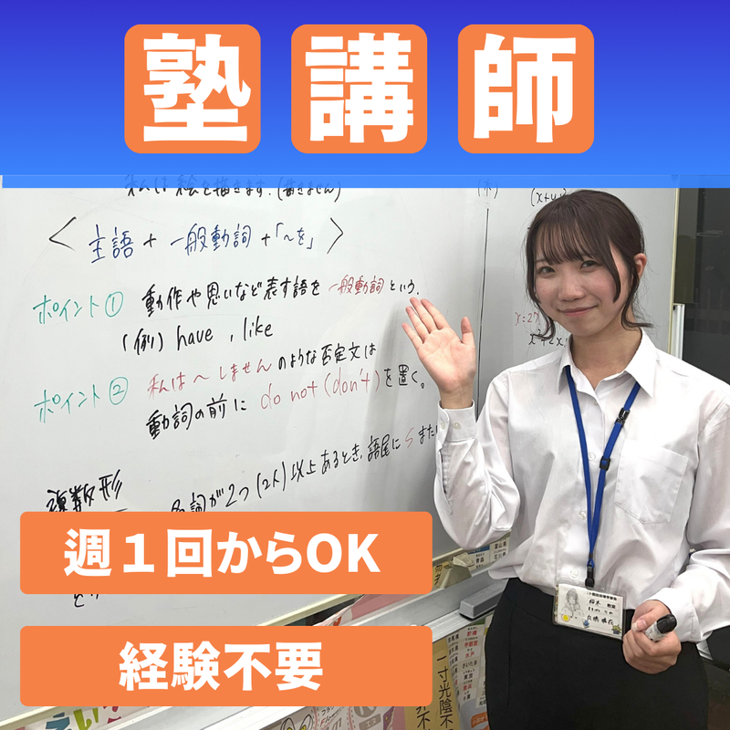 仕事内容 ホワイドボードを使った生徒2人までの対話型授業で 楽しさ・分かりやすさ・働きやすさで地域一番を目指す個別指導塾です 生徒一人ひとりとじっくり向き合える、 対話型の少人数個別授業。 教える楽しさと、人の成長に関わるやりがいを実感でき、 ここでの経験が「ガクチカ」として評価され、 希望する業界からのオファーにつながった例もあります。 ◆ 教える楽しさと高時給を両立! ・週1日~OK/空いた時間にシフトIN ・得意な教科だけでOK ・1対2の少人数個別だから教えやすい ・2025年4月、コマ給アップ改定済! ◆ 子どもと向き合う仕事は、働きやすさ◎ ・保護者や上司からのパワハラとは無縁 ・生徒と前向きに関われる、やりがいある仕事 ・優しい先輩がサポート!8割が未経験スタートです ◆ 勤務は21教室で募集中! ・県内21教室同時募集中 ・通いやすい教室で勤務OK 【仕事内容】 ・小中学生中心の個別指導 ・講師1人に生徒は最大2人まで ・授業時間は午後〜夕方 ・午前中は自由に過ごせます ・大学の授業の合間にも働けます ・簡単な事務もありますが、 別途「事務給」を支給(昇給あり) 【未経験の方も安心!】 ・メンター制度あり 慣れるまで先輩や室長がサポート ・不安なときもすぐ相談できる環境 ・得意な科目だけ、週1日からOK! 【経験者の方も大歓迎】 ・経験に応じて時給アップ ・スキルに合わせて即授業デビューも可 ・「もっと稼ぎたい」方はコマ数の調整もOK! 【得られるスキルも魅力!】 ・「分かりやすく伝える力」 ・「人と関わる力」 ・就職活動や教員採用にも役立つ力が身につきます! 【働きやすさ重視の環境】 ・準備時間もきちんと手当支給 ・残業ゼロ、無理なシフトもなし ・学生も社会人も活躍中 ・雰囲気は明るく、でも静かに集中できる空間 ◆ スタッフアンケートで満足度93%! ・「楽しい!」が99% ・学業・私生活と両立しやすいから長く続けやすい! 【ベスト個別指導学習会】 ・2005年設立/創業20年 ・県内21教室展開中 ・あなたの近くの教室で勤務可能!