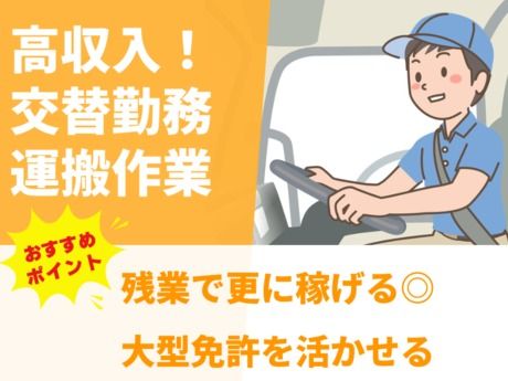 仕事内容 【仕事内容】 *・。・。*・。・。*・。・。* ★工場内ドライバー×経験を活かせる!★ ★ 30代~60代の男性活躍中! ★ 空調完備の快適な職場◎ ★ 交代勤務&残業ありでしっかり稼げる! <お仕事内容> 大手製鉄会社での鋼材運搬ドライバー♪ ■ 10トントラックで指定場所へ鋼材を運搬! ■ 玉掛・クレーンを使った積み下ろし作業もアリ◎ ■ シフト制で希望休OK!ライフスタイルに合わせて働ける♪ ★ 入社後も定期的な面談あり!相談しやすい環境◎ ★ ドライバー経験を活かして、安定収入をGET! (雇入れ直後)上記のとおり (変更の範囲)会社の定める業務 ★職場のポイント★ ◇ 空調完備!夏は涼しく冬は暖かい◎ ◇ ヘルメット着用で安全第一! ◇ 給与は毎月末締め・翌月15日支給♪ ◇ 30代~60代の幅広い年代が活躍中! 応募の流れ 応募 → 電話登録(履歴書不要) → 面談 → 職場見学 → 就業スタート! \ 経験を活かして安定収入!まずはお気軽にご応募ください♪ / *・。・。*・。・。*・。・。* 【こんな方にオススメ】 ・セカンドキャリアとしてのお仕事をお探しの方 ・フォークリフト免許をお持ちの方 ・高収入・高時給のお仕事をお探しの方 ・商品検品・仕分け・ピッキングなどの倉庫内作業の経験を活かしたい方 ・梱包・包装・組立・加工などの工場製造の経験を活かしたい方 ・検査・充填・品出しなどの機械オペレータの経験を活かしたい方 ・食品工場(肉・鮮魚・野菜・惣菜)での盛り付け・調理・材料カットの経験を活かしたい方 ・経験が浅いけどスキルアップしていきたい方 ・力仕事に抵抗のない方 ・寮完備や送迎があるお仕事を探している方