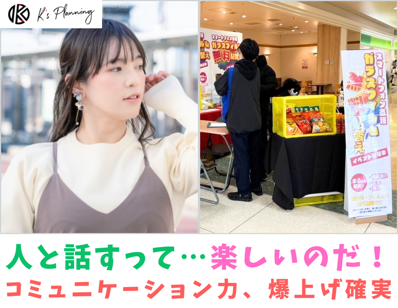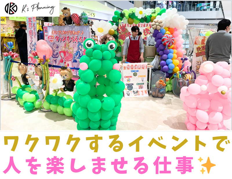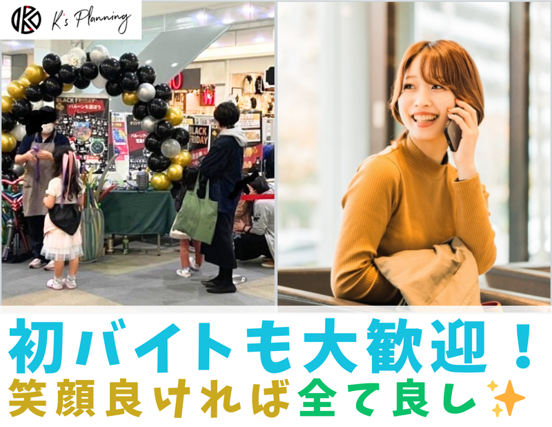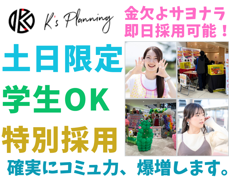 仕事内容 ✅学生のうちにやるべし✨10名の大増員✨応募資格「やる気」これのみ!✅ はじめまして! こんにちは! もしくは… こんばんは! K's Planning(ケーズプランニング) と申します。 突然ですが、 アルバイト採用を 10名、一気に集める 求人募集を始めました。 【お仕事の内容は「イベントプロモーション」】 ショッピングモールなど 各種商業施設で行われる イベントスタッフをお任せ! 具体的なお仕事項目は イベント会場での 呼び込みやアプローチ となります! 「くじ引き、ビンゴ抽選会」 「抽選会の誘導案内、景品渡し」 「アンケート回答」 「ご案内・説明」など、 ワクワク楽しい事ばかり! 我こそは!という方は、 キャラクターの着ぐるみの中に 入って頂き、ぜひとも お子さん達の人気者になってください! ✅髪型も髪色も自由でどうぞ!大切なのはやる気✨✅ 一般的なアルバイト求人とは少し違い、 驚かれるかもしれませんが、 合格の為の要素において 資格や経験を一切求めず、 「やる気があれば大丈夫✨」 としました。 初バイトの方でも間違いなく大丈夫! これには理由がありまして、 私たちのお仕事は ショッピングモールなどで実施する、 【携帯イベントプロモーション】 となります。 たくさんの人に出逢います。 声も掛けます。話もします。 「バイト行きたくないなぁ…。」 と思っていたら、 なんだか微妙な雰囲気が漂いますよね。 ” イベントプロモーション ” ですから、 そこにはアルバイトも 社員も関係なく、 やはり人に楽しんで頂く事が 私たちが実現していくべき姿! テンション高め、 コミュニケーション満載で 楽しく働いてくれる方、 どこかにいませんか!!! ✅ワクワク創出カンパニーK's Planning✅ このイベントスタッフの アルバイトのテーマは 間違いなく”楽しい”という要素が入ります。 ショッピングモール毎に オリジナルのイベントが 創りあげられていきますが ・人気キャラクターのぬいぐるみを着たり ・風船を使ったバルーングッズ制作 ・家族と一緒に楽しめるビンゴ大会 ・季節イベントに沿った抽選会 ・プールいっぱいにお菓子のつかみ取り など、 楽しみ方はそのショッピングモールや、 土地の特徴、お客様層や時期に合わせて 柔軟に変化させていく事を 目の前で学べる事も きっと大きな経験になるでしょう。 そう、 新しい事や人がワクワクする事を 企画していきながら 新たなイベントが出来ているのです。 そこに最も大切な存在は、 K's Planningの仲間達! アルバイトをした事がない方もいれば、 人と話すのがちょっと苦手な方でも、 絶対に大丈夫だと保証します。 ✅学生時代から現代最強の仕事スキル、コミュニケーションを身に付けよう。✅ 常に人と出会い、 新しい会話がある事は ラクな事ではありません。 だからこそ、 【明るさ・やる気】 を大切にしています。 コミュニケーションは どの仕事においても基本となりますが、 意識的に磨いていく事や 勇気を持って実施する事で 確実により良くなっていくでしょう。 世の中では、 【コミュ力】と言われていますが、 現代においての仕事スキルとして、 コミュニケーションの能力は外せない 最も求められる要素となっています。 もちろん、 K's Planningで仕事をすれば 最大限の成長をお約束します。 「私、そんなに明るくないほうだから無理かな…」 という方でも全然大丈夫です。 自分の中に眠る明るさは、 人間、誰しも必ずあると信じています。 何回か働くだけでも、 別人のように自信が出て 声のトーンも出ているはずです。 逆に、 元々明るくコミュニケーションする事が 得意な方であれば、 落ち着いてご自身をコントロールしながら 話していく技術も身につく事でしょう。 もしくは、 更に突き抜けて 強烈に明るくなるかどちらかかも(笑) 現場に立つ事で 自分でも驚くような 確実な成長が見込めます。 冒頭でお伝えした事の一つに、 採用条件は *** 資格や経験を一切求めず、 「やる気があれば大丈夫✨」 *** とお伝えしましたが K's Planningで働けば、 誰にでも成長の機会がある事を このアルバイト募集を通して伝われば幸いです。 持ってくるのは、 やる気のみで大丈夫。 それさえあれば、 仕事は必ず上手くなります。 新しい出会いをこれから。 ご応募をお待ちしています。 ✨K's PlanningのHPメッセージはこちらから✨ https://www.ks-pln.com/