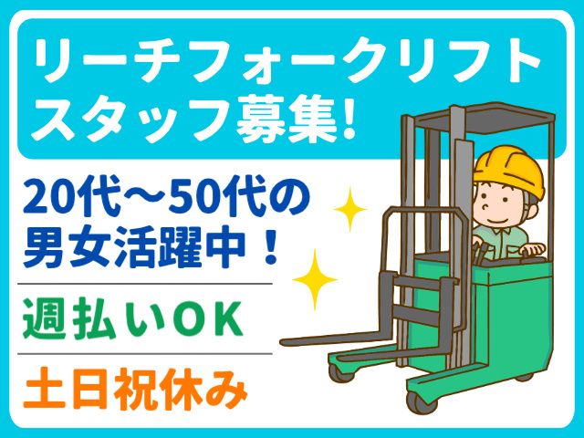 仕事内容 <急募!リーチフォークリフトスタッフ> 20代~50代の男女活躍中! フォークリフト免許を活かして働きませんか! 高時給で稼げます! <おすすめポイント> ・20代・30代・40代・50代活躍中! ・時給1,300円~1,350円の高時給! ・週払いOK ・車通勤OK ・土日祝休み フォークリフト免許をお持ちであれば ブランクがある方もOK! 初めは先輩スタッフが 丁寧に指導いたします! 自信をもって働けるまで しっかりサポートします! <お仕事内容> 冷蔵・冷凍倉庫で業務用食品を 取り扱うお仕事です。 ・リーチフォークを使用した商品の入出庫 ・ピッキング、仕分け、検品作業 フォークの使用割合としては 7~8割程度で、残りは手作業となります。 作業服・安全靴・ヘルメットなど 必要なものは全て貸与します! フォークリフト経験のある方、 製造業や倉庫作業経験のある方など これまでのご自身のキャリアや 経験を活かして活躍できます! <20代~50代活躍中!> 若者から中高年の方が活躍中です。 幅広い世代の方に活躍して いただける職場なので、これから スキルアップしたい方はもちろん、 中高年の方もスキルや経験を活かして 活躍できます。 <うれしい土日祝休み> GW、年末年始休暇もあるので プライベートも充実できます! <こんな方にオススメ> ・フォークリフトスキルのある方 ・工場内・倉庫内作業経験がある方 ・資格や経験を活かして働きたい方 ・安定して長く働きたい方 <事前職場見学OK> ご自身の目で実際の 職場環境見てみませんか? リーチフォークリフトを見てみたい、 冷蔵・冷凍倉庫でのお仕事が初めての方は どんな作業をするのか分からないと思います。 そんなお仕事前の不安を解消できます! お気軽にお問い合わせください!