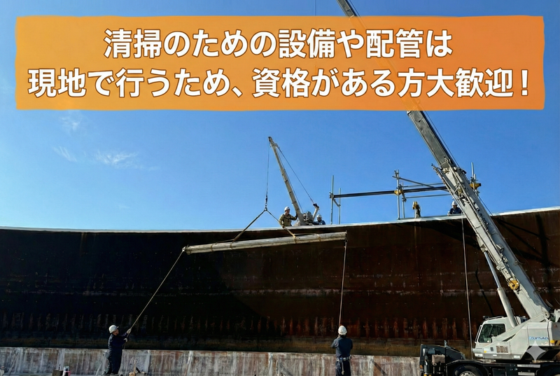 求めている人材 < 現場経験がある方であれば大歓迎 > < 幅広いスキルや資格が活かせます > □■ 応募に必要な条件 ■□ *業界・現場系作業の経験がある方 (職種・年数は不問) *安全意識を持って作業できる方 *チームワークを重視して行動できる方 □■ 歓迎するご経験・資格 ■□ *玉掛け技能講習修了者 *ユニック車運転経験者 (小型移動式クレーンなど) *クレーン運転特別教育修了者 *乙種第4類危険物取扱者 *配管工・洗浄工・設備工の経験者 *大型自動車免許保有者 ※いずれかに当てはまる方は大歓迎! □■ こんな方にピッタリ ■□ ・頑張りを正当に評価されたい ・収入もキャリアも上を目指したい ・後進世代の指導にも関わっていきたい ・少人数の職場環境でテキパキ働きたい
