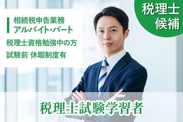 【アピールポイント】 税理士試験受験中の方対象大募集! ■週4日/一日7時間~勤務可 ■税理士試験1か月前は試験休暇でお休み可! ■税理士目指す方大歓迎!資格取得に向け万全なサポート体制有り! ■土日祝休み・年休122日 ■残業月平均5時間程度 ■繁忙期ほぼなし 相続税に特化した税理士法人でスキルを磨きませんか?