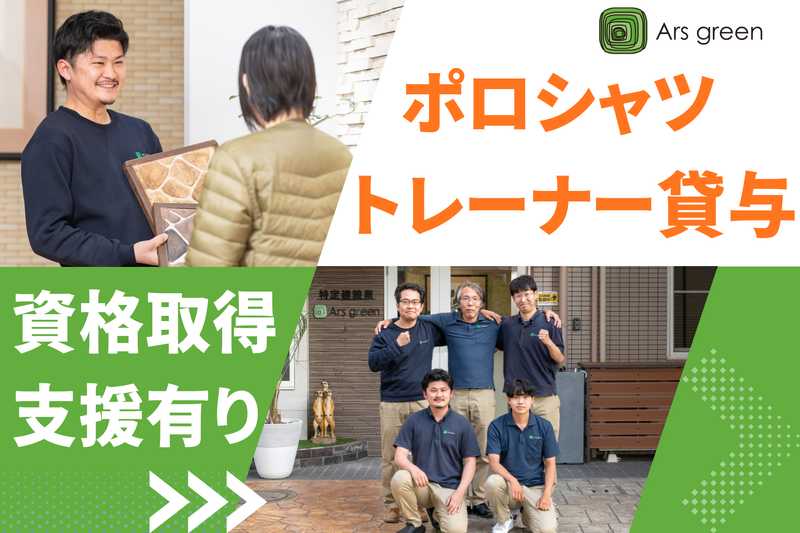 仕事内容 ✨………………✨………………✨ お客様から依頼を受けて営業開始! 新規開拓や飛び込みも一切ナシ! スーツを着ない営業スタイル◎ ポロシャツ・トレーナー貸与有り♪ ✨………………✨………………✨ ✅HP・業者からの依頼など反響営業のみ! 「ノルマに追われて…」や「「アポ無しの飛び込みで訪問がきつくて…」 などの心配は一切ご無用!「営業職」のイメージが変わる、やりがいのあるお仕事です! ✅嬉しい完全週休2日制! 水曜日+週のどこかで必ずシフト1日休みの完全週休2日制。 シフトはなるべく希望に沿う形で作成するので、しっかり休めますよ♪ ✅春夏はポロシャツ・秋冬はトレーナー、ジャンパーで勤務♪ スーツは基本着ない営業スタイル◎ 当社オリジナルのポロシャツとトレーナー、ジャンパー貸与で、 カジュアルなスタイルで働けます! ✅社内教育が充実! 「前職では全く違う仕事をしていた…」といった方もしっかり活躍できる環境を整えています。 インテリアや住宅の知識が無いという方もご安心ください♪ 簡単な図面作成も行うこともあるため、そのための教育制度も完備しています! ✅資格取得支援あり! 取得したい資格がある方は会社が全力応援! 昇給&自身のスキルアップにもつながりますよ♪ 実際にこの制度を活用し、 1級造園施工管理技士、1級土木施工管理技士、2級土木施工管理技士 などの資格を取得した社員も在籍しています。 資格取得を目指す理由は、 「きちんとした資格を持ち、 お客様や取引先に安心して仕事を任せてもらえる営業でありたい」 という想いから。 また、取得した資格はしっかり評価し、 資格手当や昇給など、給与にも反映されます。 スキルアップしながら、 収入面でも成長を実感できる環境です! ✅他にもイロイロ... ◎施工件数も毎年増加しており業績安定! ◎入社日の相談OK! ◎ハローワークで仕事をお探しの方も歓迎します。 HPなどを見て問い合わせをくださったお客様や業者さんから、依頼を受けて提案をする反響営業のお仕事! すでに興味を持ってくれている相手とのやり取りになるため、お話もスムーズに進みやすく成約率も高いので、これまでに営業経験がない方も活躍していますよ♪ 先輩スタッフが丁寧に教えるので、未経験スタートでも安心してくださいね。 <具体的な仕事内容> □提案・設計 □お客様との打ち合わせ □現地調査、測定 □見積作成 □工期の調整 □図面作成の指示 など <お問い合わせの対応から引き渡しまでを担当> お客様からお問い合わせがあってから 引き渡しまでの営業スタッフの工程をご紹介します◎ (案件内容・現場状況により前後します) (1)お問い合わせ 一般のお客様からお問い合わせをいただきます。 (2)初回打ち合わせ(ご来社) お客様に図面をご持参のうえご来社いただき、 ご希望や条件をヒアリングします。 (3)現地確認・図面作成(約7日) 現地を確認し、必要に応じて採寸・調査を行います。 その内容をもとに図面作成やプラン検討を進めます。 ※この工程で約7日程度かかることが多いです。 (4)2回目打ち合わせ(図面・お見積提示) 作成した図面とお見積書をご提示し、内容をご説明します。 (5)お打ち合わせ(合計 約4回) ご要望の調整・仕様決定など、 合計4回ほど打ち合わせを重ねて最終確定します。 (6)施工開始 → お引き渡し 内容確定後に施工を開始し、完了後にお引き渡しとなります。 お客様の希望に合わせて、駐車場の屋根(カーポート)や門、雑草対策グッズや地面の工事(舗装)などを提案・設計します。 現場の状況や予算に合わせた効果的な提案をし、お客様との打ち合わせを重ねながら最適なプランを完成させていきましょう♪ 事務作業もありますが、PCの基本操作ができればOK! 【当社について】 令和元年5月に20周年を迎えたアルスグリーンでは、エクステリア・ガーデニング、外構に関する商品を多数取り扱っております。 Googleクチコミは12/23時点で星4.9! 様々なお客様に温かいお言葉をいただいております(^^) 公式のインスタも稼働中 → 『@arsgreen_recruit』 主に施工事例などをご紹介。少しでも弊社の仕事内容や雰囲気を知っていただけたら幸いです!