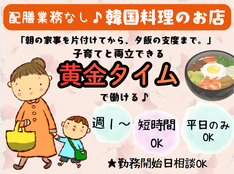 仕事内容 ☆高時給1200円にUPした今がチャンス! ☆週1~OK、働き方が選べるのが嬉しい! ★高校生・大学生・フリーター・ 主婦まで活躍中! 野菜・キムチ・卵・牛肉・海苔… 食材にこだわった身体に優しいが コンセプトの石焼ビビンバ専門店。 フードコート内にある店舗だから カウンター越しの対応になります。 料理を席まで運ぶ必要がないので、 飲食バイトが初めての方にも チャレンジしやすいと思います! まずはレジや料理提供から始め、 徐々に仕事の幅を広げていきましょう。 \ 9時~21時の間で相談OK / 週1日~のシフト制だから 都合に合わせて無理なく働けるはず! しかもシフトは2週間毎の提出スタイル。 スケジュールに合わせて調整OKです! 平日のランチに働く主婦さんや 土日祝のランチで働く学生さん、 Wワークでシッカリ稼ぐフリーターさん、 スキマ時間を有効活用している 幅広い世代のスタッフが活躍中です。 「お小遣い稼ぎ」や「家計の足し」、 「趣味」「仲間探し」など始める理由は みんなそれぞれでOK!もちろん、 パートデビューの方も大歓迎します! ★パートの前後にお得にお買物もできちゃう♪ ―――――――――― 正社員も同時募集中! ―――――――――― 月給25万円~ 詳細は面談にて