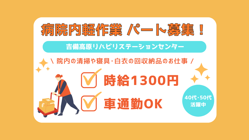 仕事内容 吉備高原医療リハビリテーションセンターにて、 院内の清掃、リネンの分別、白衣類の納品・回収などの 業務を行っていただきます。