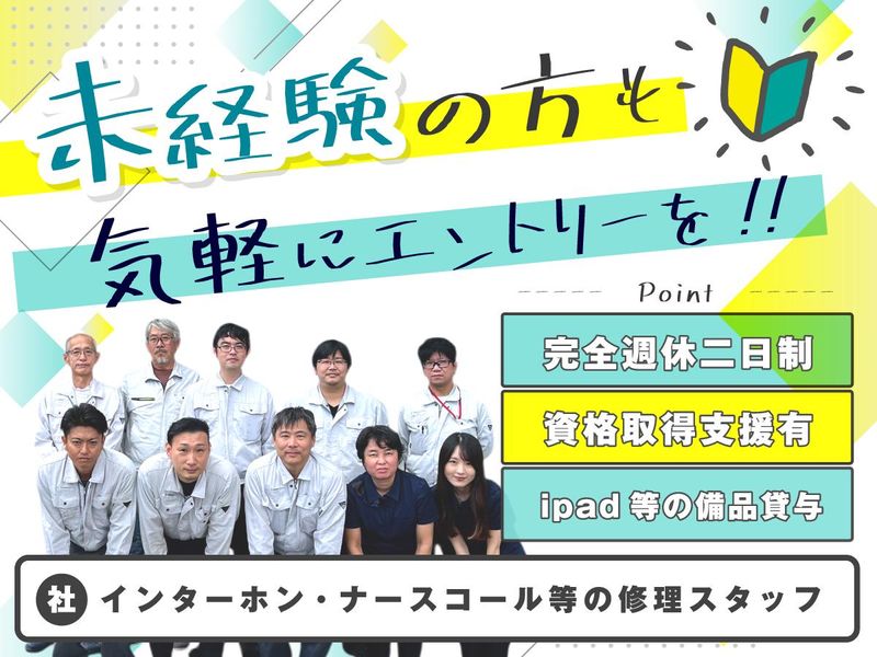 仕事内容 【求人のPOINT!】 ✨業界トップクラス企業の正規代理店 ✨住宅や病院に欠かせないから安定経営 ✨未経験歓迎&資格取得は会社全額負担 ✨賞与年2回!【年収560万円以上可能】 ✨完全週休2日制&年間休日115日 ✨入社後2~3ヶ月は先輩が同行して教育 ✨社内のテスト機で訪問前にテストできる ✨ありがとう!と感謝される修理の仕事 ・・・・・・・・・・・・・・・・・・・・・・・・・・・・・・・・・・・・・・・ インターホン、ナースコールで 業界トップクラスの東証プライム上場企業 アイホン株式会社の代理店として 修理・点検を担当している会社です。 アイホン株式会社と直接契約しており マンションや病院に不可欠な設備なので 景気にまったく左右されません! しかも入社後に 第二種電気工事士や消防設備士の 資格取得費用を全額会社負担! 社内研修も実施して取得をバックアップ! キャリアアップできる超安定企業です♪ ・・・・・・・・・・・・・・・・・・・・・・・・・・・・・・・・・・・・・・・ ⏩仕事内容⏩ ✅業務スケジュールの確認 ✅社用車でお客様を訪問 ✅インターホン・ナースコールの修理 ✅日報作成などのデスクワーク、等 \修理は基本1人で動きます/ 訪問先はすべてアポイント済みで ipadでスケジュールを確認できます。 訪問エリアは福岡と佐賀がメインで 1日あたり2件~5件程度を回ります。 修理は基本1人で訪問するので 集中してコツコツ進められますし あなたが感謝の言葉を受けられます。 また社内にテスト機があるので 訪問する前に不具合が起きている 原因をしっかりテストできますよ! ・・・・・・・・・・・・・・・・・・・・・・・・・・・・・・・・・・・・・・・ ⏩1日の流れ例⏩ 出社後、ipadで1日のスケジュールを確認 ▼ 修理の準備を行い社用車で出発 ▼ インターホン・ナースコールの修理 ▼ ランチタイム 事務所では飲み物を準備しています ▼ 修理の現場作業を再開 ▼ 事務所で講習会を行う日も ▼ 事務所でデスクワーク ▼ 次の日の準備をして帰宅 ・・・・・・・・・・・・・・・・・・・・・・・・・・・・・・・・・・・・・・・ ⏩教育について⏩ 入社後2~3ヶ月は先輩に同行して 修理現場の見学からスタート! 慣れてきたら先輩がサポートしながら 少しづつ作業を行っていただきますので 未経験の方も安心してご応募ください! ・・・・・・・・・・・・・・・・・・・・・・・・・・・・・・・・・・・・・・・ ⏩メーカーとの共同研修が年4回⏩ 新商品の研修や機器内部の詳しい仕組み、 動作原理など一般的な電気工事会社より 深く専門的な知識を習得できるので 将来的なキャリアアップに繋がります! ・・・・・・・・・・・・・・・・・・・・・・・・・・・・・・・・・・・・・・・ ⏩プライベートも充実⏩ 休日は完全週休2日制で平日1日と 土曜・日曜のどちらか1日がお休みです。 基本的に希望通りに休みが取れるので お子様の学校行事の休みも対応可能! 金土や日月など連休も取りやすいので、 旅行や家族との予定も立てやすいですよ。 ・・・・・・・・・・・・・・・・・・・・・・・・・・・・・・・・・・・・・・・ ⏩職場環境⏩ 現在、代表を含めて男性4名・女性2名。 現場ではお客様から「ありがとう!」と 直接言ってもらえることも多く 誰かの役に立っている実感が湧いてきます。 福岡のオフィスは移転してまだ4年目。 デスクや家具も新しく広々キレイです♪ なんと軽食やドリンクを1つ50円~で提供。 おやつタイムに困らず好評です! ちなみに会社の飲み会は年1~2回くらい。 飲み会で社員の時間の奪いません◎ ・・・・・・・・・・・・・・・・・・・・・・・・・・・・・・・・・・・・・・・