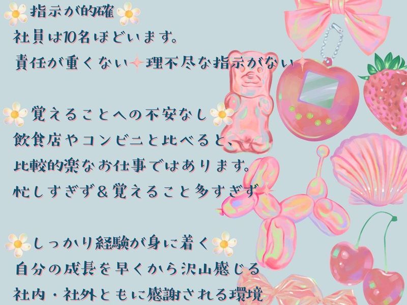 求めている人材 ――⭐雰囲気の良さが自慢です! どんな方・どんな理由でも歓迎します♪ ✅穏やかで親しみやすい雰囲気 ✅いつでも相談できる社員います ✅仲間と楽しく働ける ✅お休み希望に対応 ✅見た目やオシャレの自由度高め ⭐人気ポイント⭐ ✅指示が的確 社員は3名ほどいます 責任が重くない✨理不尽な指示がない✨ ✅覚えることへの不安なし 飲食店やコンビニと比べると比較的楽なお仕事ではあります しかし、しっかり接客販売経験が身に着きます 自分の成長を早くから沢山感じられる✨
