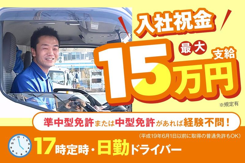 仕事内容 【普通免許があればOK!】 業務に必要な中型免許の取得は 会社がサポート! 取得費用を一部負担いたします◎ 未経験から安定勤務のチャンス♪ もちろんドライバー経験者も大歓迎! ◆千葉県内のみの地場配送 ◆固定シフトで生活リズム安定 ◆お休み希望は100%通ります! ◆最長1ヶ月の研修で丁寧に指導します! ―――――――――――――――――――― 千葉県内の大手コンビニに 食品や飲料などを配送していただきます。 【車両】3t冷凍冷蔵車 【ルート】8~10店舗の配送を1日2便 ◇長距離ナシ&固定ルート配送なので 体の負担は少なめ。 一度覚えてしまえばラクラクです! ◇普通免許があればスタートできるので、 ドライバーデビューも大歓迎♪♪ 中型免許の取得サポートや、 一人ひとりのスキルに合わせた研修を ご用意しています。 最長1ヶ月かけて丁寧に指導するので、 自信を持ってスタートできますよ! もちろん準中型・中型免許をお持ちの方も 免許や経験を活かしていただけます◎ ◇ドライブレコーダー、バックアイカメラ、 GPS運行管理システムを搭載。 悪天候や工事・事故渋滞などによって トラブルが起きた場合も、 事務所と仲間がスグにサポートします。 ――――*ガッツリ稼げます!*――――― 未経験スタートでも月給34万~40万円! 業績に応じて賞与も支給します。 「頑張っているのに給料が上がらない」 「今より高収入を目指したい」 そんなアナタも満足できるはずです♪ さらに、入社祝い金を最大15万円支給! 入社1ヶ月後と半年後にゲットできるから、 モチベーションもアップしますよ! ―――――*固定シフトで安定*――――― 勤務時間は朝4~17時で固定! 生活リズムを崩さずに働けます! その他の時間帯も相談OK◎ 「家族との時間が欲しいから日勤」 「夜勤でしっかり稼ぎたい」など、 ライフスタイルやスケジュールに 合った働き方をご相談ください! ―――*お休みの融通もききます*―――― シフトは2週間毎に決定。 お休みの希望も100%通ります! 先の予定が分からない方も安心です。 お子さんの学校行事にも参加できますし、 推しのライブも気兼ねなく観に行けます! 有給取得率も高いですよ♪ ――――*だから定着率が高い!*―――― 「無理なく自分のペースで働ける環境」を 大事にしている当社。 おかげさまで定着率が高く、 20代~50代という幅広い世代の男女が イキイキと働いています◎ ――――――――――――――――――――