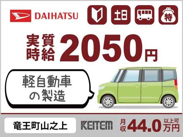 仕事内容 【ダイハツ自動車の組立作業(ネジ締めなど軽作業)】 ダイハツ竜王工場の軽自動車を作る工場でのお仕事です。 組立や部品加工など、いずれかの工程から 一人ひとりの適性にあわせた作業をおまかせします。 ▼仕事詳細 <組立> 車の骨組みがライン上を流れてきますので、 ドアやハンドルなどの部品を工具を使って組み立てます。 ▼その他の作業例 ・銅板のプレス加工(金属の型抜き) ・小さな部品の溶接(金属同士を接着する) ・検査(汚れや傷の確認) など 【求人担当者からヒトコト】 基本は同じ作業をコツコツくり返す ルーティンワーク! 重量物の運搬は機械が補助するので 体への負担も少ないです。 どの工程もしっかりした研修があるので、 未経験の方もご安心ください! ・。'.・。'.・。'.・。'.・。'.・。'.・。'.・。 ◆ おすすめポイント ◆  ̄ ̄ ̄ ̄ ̄ ̄ ̄ ̄ ̄ ̄ ̄ ̄ ̄ 【ダイハツ自動車の組立作業】 『未経験から月収44万円以上可!』 #実質時給2050円 #20~40代活躍中 #年間最大20万円支給 #経験不問 #土日休み #長期休暇年3回 #車バイク通勤OK #組立 ・。'.・。'.・。'.・。'.・。'.・。'.・。'.・。 ◆ 職場環境について ◆  ̄ ̄ ̄ ̄ ̄ ̄ ̄ ̄ ̄ ̄ ̄ ̄ ̄ 『月収44万円以上なら毎月30万円以上が自由に使える!?』 ━━━━━━━━━━━━━━━━━━━━ 収入・支出のイメージ(概算) ━━━━━━━━━━━━━━━━━━━━ ▼収入 月収:440,000円 ▽支出 寮費:0円 食費:40,000円 日用品:10,000円 通信費:10,000円 水道光熱費:17,000円(金額固定/規定あり) 社会保険料など:40,000円 ※社会保険料などは個別に異なるため目安です - 残り:323,000円 ・。'.・。'.・。'.・。'.・。'.・。'.・。'.・。 ◆ 採用担当よりPR ◆  ̄ ̄ ̄ ̄ ̄ ̄ ̄ ̄ ̄ ̄ ̄ ̄ ̄ (1)実質時給2050円×特別手当で年間最大20万円支給! (2)未経験の方も安心の研修充実 (3)土日休み、長期休暇年3回でプライベートも充実 ・。'.・。'.・。'.・。'.・。'.・。'.・。'.・。 ◆ 業界未経験者大歓迎 ◆  ̄ ̄ ̄ ̄ ̄ ̄ ̄ ̄ ̄ ̄ ̄ ̄ ̄ 以下の業界での勤務経験のある方も活躍中! ・自動車整備業界 ・物流・運輸業界 ・飲食業界 ・小売業界 ・サービス業界 ・アミューズメント業界 ・インフラ業界 ・ホテル業界 etc. ・。'.・。'.・。'.・。'.・。'.・。'.・。'.・。 ◆ 土日休みのお仕事 ◆  ̄ ̄ ̄ ̄ ̄ ̄ ̄ ̄ ̄ ̄ ̄ ̄ ̄ 〈スタッフの声〉 週末はしっかり休みたい方にオススメのお仕事です。 平日は集中して働き、週末は自分の時間を大切にできます。 友人と旅行にも行きやすく、プライベートが充実できます! ・。'.・。'.・。'.・。'.・。'.・。'.・。'.・。