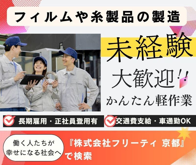 【保険制度】 雇用保険、労災保険、健康保険、厚生年金 待遇・福利厚生 【福利厚生】 ・退職金制度 ・交通費支給 ・バイク、自転車通勤可 ・制服貸与 ・長期休暇あり ・副業・WワークOK ・社員食堂あり ・更衣室:有 ・制服・安全靴・ヘルメットなど貸与 ⭐FReety派遣のメリットは…?⭐ ・派遣でも社会保険完備と手厚い待遇 ・派遣先企業様と求職者様を専任担当者が入社前から入社後もずっとサポート! ・未経験でもできる案件多数ご用意!
