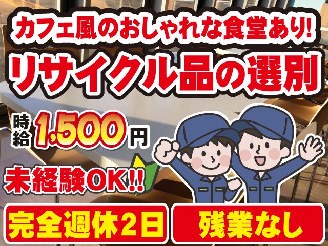 仕事内容 2023年オープンのきれいな施設でのリサイクル品の仕分け・選別 【おすすめポイント】 ・入社祝い金あり ・時給1,500円 しっかり稼げる 無資格、未経験でも月収264,000円~ ・日払いOK、週払いOK ・完全週休2日(土日祝休み) ・お盆休み・年末年始など長期休暇も充実 ・日勤(8:00~17:00勤務) ・残業ほぼなし!17時ピッタリにお仕事終了 ・マイカー通勤OK(無料駐車場完備) ・お友達、お知り合い同士の応募も大歓迎 ・面接は来社不要、電話やWEBで行えます ・履歴書不要 【仕事内容】 構内でリサイクル品を仕分けるお仕事です。 4~6名のチームで作業!少人数での作業だから働きやすい! 最初は丁寧にサポートします、 慣れてきたら自分のペースで作業を進めてOKです! 【業界未経験、仕分け未経験の方大歓迎】 未経験・無資格でOK! もちろん下記のような経験のある方は、資格やスキルを活かして働けます。 ・工場での重機作業経験 ・機械の修理や維持管理の経験 ・カウンターフォーク運転 【職場環境】 休憩スペース、設備が充実していて快適に働けます。 ・仮眠室・シャワー室完備 ・カフェ風のおしゃれな食堂あり ・作業場近くにも休憩室があり、小休憩もしっかりとれる ・防塵マスクや制服、靴など貸与 ・冬用のジャンパー貸与 ・夏場は空調ベスト貸与 【GWJが"ぴったりのお仕事"探しを応援】 GoodWorkJapan/グッドワークジャパンは「人に合う仕事探し」を大切に、 ・日払い対応 ・Web面接 で スムーズな就業・転職をサポートします。 面談後は職場見学で実際の雰囲気を確認できるので安心です。 まずは登録から!あなたのご希望をお聞かせください! ここまでご覧いただきありがとうございます。 興味を持っていただけた方はお気軽にご連絡ください。