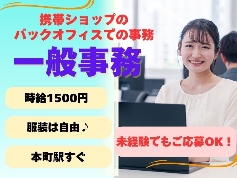 概要 一般事務 募集職種 一般事務・営業事務・アシスタント 雇用形態 派遣社員 募集内容 この求人のポイント 一般事務/未経験OK/社会保険完備/交通費支給/大阪市中央区/fQ5087h【一般事務 】携帯ショップのバックオフィス/1500円/9:30スタート/直雇実績あり 【事務経験がなくてもご応募OK!】 法人(企業)を担当している営業さん の事務サポートがメイン (スマホの開通作業をや プラン変更の手続きなど) バックオフィスだから、 落ち着いてお仕事できる環境です! 社員さんもすぐ近くに& フォロー体制もしっかりで安心♪ ★定着率の高い会社 ┗直接雇用実績もあり! 長期勤務を目指すチャンス♪ ★駅チカ ┗本町駅徒歩1分!駅直結のビルです \\携帯電話業務経験者、大歓迎!// 休憩時間は1時間 好きな時に取れます♪ そしてみなさんとても親切♪ 明るく活気ある雰囲気の中 楽しくお仕事されています♪ ……………………………………… <お仕事内容> ▼営業アシスタント (法人向け携帯電話に関するオシゴト) 具体的には・・・ ■法人向け携帯電話の開通業務 ■プラン変更や確認 ■営業さんが受注された案件の 書類作成 <丁寧な指導&マニュアルあり!> ・マンツーマンでしっかり 引き継いでいただけます ・社員の方がすぐ近くにおられ フォローがあるので安心! <ポイント> ◎服装自由!ジーンズやスニーカーOK ┗みなさん好きなファッションで のびのびと働かれています! ◎プライベートとの両立もバッチリ! ┗残業なしでスッキリ退社 ◎駅チカ ┗本町駅直結で通勤ラクラク! 周辺施設も充実! ◎直雇用の可能性あり ┗安定勤務を目指されている方、 チャンスです! フロア人数:20名 食堂・休憩室・服装:オフィスカジュアル 【ご登録内容を確認後、ご紹介可能な場合のみご連絡いたします。ご応募いただいたお仕事以外にも、複数のご紹介が可能な場合がございます。応募フォームの「備考」欄よりご希望の職種(業務内容等)をお知らせください。】 勤務地: 大阪府大阪市中央区 アクセス: 大阪メトロ御堂筋線本町駅より徒歩 1分 大阪メトロ中央線本町駅より徒歩 3分 業種・業界 人材紹介・派遣業 必須スキル・経験・資格 Word:既存修正 Excel:修正入力 勤務期間:長期(3ヶ月以上) 受動喫煙防止措置条項 屋内禁煙