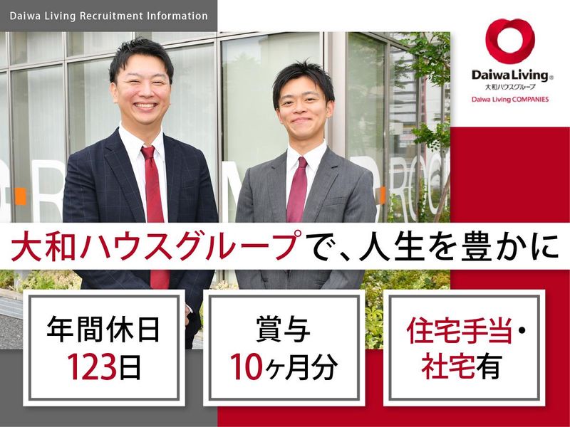 仕事内容 \ キャリアアップ × 安定収入を実現 / 不動産業界での営業経験を活かして、 大和ハウスグループの一員として働きませんか? ◤大和リビングで働くメリット ◢  ̄ ̄ ̄ ̄ ̄ ̄ ̄ ̄ ̄ ̄ ̄ ̄ ̄ ̄ ̄ ̄ ・東証プライム上場「大和ハウスグループ」 ・前職給与の一定考慮あり(キャリアアップ応援) ・賞与10ヶ月分、2年目で年収700万円以上も可能 ・完全週休2日(水・日・祝休み)+年休123日 ・フレックスタイム制 & リモートワーク導入 ・住宅手当や社宅制度あり(家賃最大65%補助) ・自己負担は1.5万円/月~で住める格安寮あり ・子ども誕生時に最大100万円の祝い金 ・大手ならではの教育・研修制度 → 福利厚生・制度の充実度はここに書ききれません。 ぜひ最後までお読みください。 ◤ こんな方におすすめ ◢  ̄ ̄ ̄ ̄ ̄ ̄ ̄ ̄ ̄ ̄ ̄ ̄ ・資格を取ったのに給与が上がらない ・福利厚生や賞与のしっかりした大手で働きたい ・業界内でも離職率が低い会社に行きたい ・経験を活かしてもっと稼ぎたい ・大手企業でキャリアアップしたい ・フレックスやリモートで柔軟に働きたい ・無駄な残業を減らし、メリハリをつけて働きたい ◤ 大和リビングの強み◢  ̄ ̄ ̄ ̄ ̄ ̄ ̄ ̄ ̄ ̄ ̄ ̄ 大和ハウスグループの一員として、 賃貸住宅の管理・運営を担っています。 扱うのは、大和ハウス工業が建築する「D-ROOM」。 分譲マンション並みの設備を備えた、 高品質な賃貸住宅ブランドです。 オーナー様には「長期安定経営」を、 入居者様には「安心・快適な暮らし」を提供。 信頼関係を長期的に築いていけるのが、 この仕事の大きな魅力です。 さらに、ストック型ビジネスにより、 管理戸数・売上高ともに右肩上がりで成長し続けています。 ◤ 仕事内容 ◢  ̄ ̄ ̄ ̄ ̄ ̄ ̄ ~全てのお客様に感謝し、感謝される存在に~ 賃貸住宅「D-ROOM」の入居者様サポートから、 オーナー様へのリフォーム提案、 新規管理物件の仕入れ営業まで幅広く担当します。 【主な業務】 ・入居者様対応(契約、生活サポート、退去手続き) ・オーナー様対応(リフォーム提案、定期報告など) ・仲介会社との調整(入居募集に関する折衝) ・工事会社との打合せ(リフォーム・リノベーション工事) ・新築物件の企画提案(市場調査、間取り・賃料設定) ・既存物件の仕入れ営業 「売って終わり」ではなく、 お客様と長く信頼関係を築く営業スタイルです。 ◤ 労働環境 ◢  ̄ ̄ ̄ ̄ ̄ ̄ ̄ ・フレックスタイム制度 ・勤務間インターバル制度 ・リモートワーク導入 ・完全週休2日制 ・年間休日123日 ・15時退社できる「プレミアムデー」実施 大手ならではの安心できる環境で、 無理なく長く働き続けられます。 ◤ 最後に ◢  ̄ ̄ ̄ ̄ ̄ ̄ 「もっと稼ぎたい」 「もっと安定した環境で働きたい」 「もっと家族との時間を大切にしたい」 その想いを、ここで叶えませんか? あなたの経験を活かし、次のステージへ。 ご応募をお待ちしています。