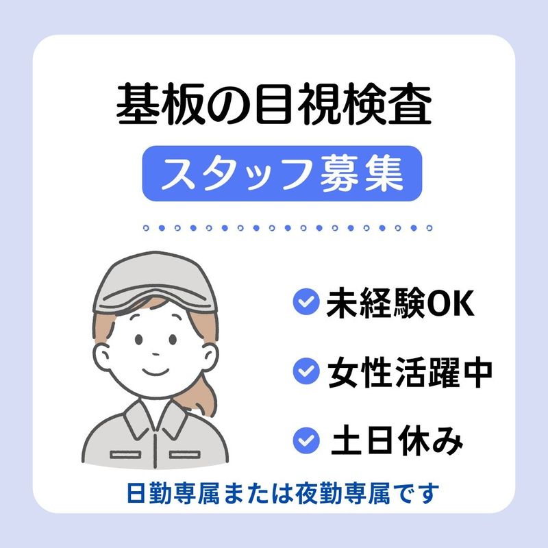 仕事内容 〓〓 お仕事内容詳細 〓〓 製品の最終工程での検査を行うお仕事です。 適性に応じて配属先を決定いたします。 ・製品の目視検査 ・拡大鏡等を使用した検査 ・パソコンを使用した検査 ・その他付随作業 等 難しい作業はありません。 勤務は日勤専属か夜勤専属となります。 夜勤専属の方でも、最初は日勤で勤務します。 作業を覚えたら夜勤専属となります。 期間は未定です。覚えたら順次異動します。 交代勤務はありません。 未経験者OKのお仕事です。 はじめは先輩社員がサポートするので、知識がなくても安心です。 今後生産量が見込まれるための増員です。 〓〓 ポイント 〓〓 ・土日休み(祝日は勤務の場合あり) ・未経験者OK ・女性が多く活躍しています ・制服貸与 ・残業が多少あります ・夜勤専属でも覚える迄は日勤での勤務 〓〓〓〓〓〓〓〓〓〓 職場見学ができるので、安心して就業開始が可能! お問い合わせ・ご応募お待ちしております(^^)/