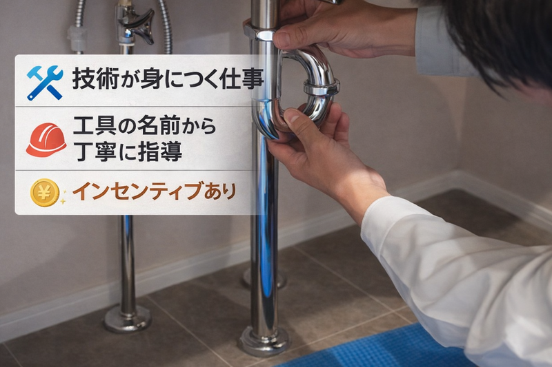 仕事内容 ■ 水回りトラブル対応スタッフ 法人施設を中心に、水回りのトラブル対応を行う仕事です。 水漏れや詰まりなどが発生したお客様先へ訪問し、点検・修理・部品交換を行います。 未経験の方も、先輩社員と同行しながら基礎から学べます。 ◆ 具体的な業務内容 ・ 水漏れの点検・修理 ・ 排水の詰まり除去 ・ パッキン・バルブなどの部品交換 ・ 給排水設備の点検・メンテナンス ・ 作業報告書の作成 作業はマニュアルや工具の使い方から丁寧に教えます。 ◆ 対応先 ・ 大手コンビニ ・ 飲食チェーン店 ・ 郵便局 ・ ガソリンスタンド など 法人案件が中心のため、落ち着いた環境で作業できます。 ◆ 1日の流れ ・ 1日5~8件程度 ・ 1件あたり15分~2時間ほど ・ 無理なスケジュール詰め込みはありません ◆ この仕事の役割 「今すぐ直してほしい」というお客様の困りごとを解決することが役割です。 水が止まらない トイレが使えない 排水が詰まって営業できない そうした状況を迅速に改善し、日常や営業を元に戻します。 単に修理するだけではなく、 ● 原因の説明 ● 修理内容の説明 ● 今後の予防方法の案内 まで丁寧に行い、安心していただくことも大切な仕事です。 ◆ 未経験の方へ 最初は先輩社員と一緒に現場へ行き、 工具の名前や使い方から覚えていきます。 ベテランスタッフが多く、落ち着いた雰囲気の職場です。 「見て覚えろ」という環境ではありません。 技術を身につければ、将来も長く続けられる仕事です。 PRポイント①|未経験から手に職がつく 水道や設備の知識がなくても問題ありません。 先輩スタッフとの同行やサポート体制が整っており、 基礎から実務まで段階的に身につけられます。 PRポイント②|安定した仕事量と将来性 コンビニ・飲食チェーン・公共施設など、 安定した取引先が多く、景気に左右されにくい仕事です。 長く安心して働ける環境があります。 PRポイント③|無理のない働き方 1日の対応件数は5〜8件程度。 スケジュールに余裕を持たせているため、 慌ただしく追われる働き方ではありません。 PRポイント④|頑張りが収入に反映される 月給25万円スタートに加え、 成果に応じたインセンティブ制度があります。 未経験から高収入を目指すことも可能です。 PRポイント⑤|働きやすいサポート体制 社用車・機械は会社支給 直行直帰OK(研修後) 困ったときはすぐに相談できる環境 仕事に集中できる体制を整えています。