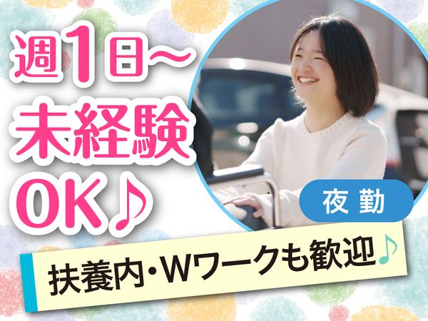 仕事内容 夜勤専従のお仕事が初めての方も大歓迎〇 まずは週1勤務で慣れたら週2勤務などもOK! 働き方はお気軽に相談を! 【お仕事内容】 入居されている方の自立支援をサポートするお仕事です。 介護が初めての方にも、1からサポートしますので安心して始められます。 【具体的には】 ・お食事準備やお話し相手 ・服薬管理 ・清掃、洗濯 ・消灯後の巡回(不眠時の入居者様支援) ・その他生活援助や見守り など ※介助が必要な方には食事・入浴・排泄の介助もお願いします。 ※お食事に関しては、献立が毎食決まっており、レシピもあります。 1からの調理ではなく、食材のカット・温め・盛り付けがメインなので、難しい調理作業はありません。 《夜勤の主な1日の流れ》 ・17:00~ 出勤 引継・夕食準備 ・18:00~ 食事介助 ・19:00~ 服薬・入浴介助・見守り・洗濯 ・21:30~ 巡回 ※入居者様不眠時のサポート ・6:00~ 朝食準備・食事介助 ・7:00~ 掃除・入居者様支援 ・9:00 退勤  ̄ ̄ ̄ ̄ ̄ ̄ ̄ ̄ ̄ ̄ ̄ ̄ ▶ 選ばれる理由について 【働きやすさ】 介護施設では高度な医療ケアや介護が必要な一方で、 障がい者グループホームでは、日常生活の生活支援が中心。 そのため介護施設に比べて3大介助(食事、入浴、排泄) の負担が少なく、身体的にも精神的にも 余裕を持って働くことができる環境です! 【初めての方でも安心】 “障がい者施設で働くのは初めて” という方もたくさん在籍しています! 「どんな方がいるのか」、「イレギュラー対応はどうするのか」・・・ そんな気持ちがわかる先輩ばかりなので安心してくださいね♪ 入社時の研修や、緊急時のマニュアル完備はもちろん、 希望者には入社前に施設見学も行っています!