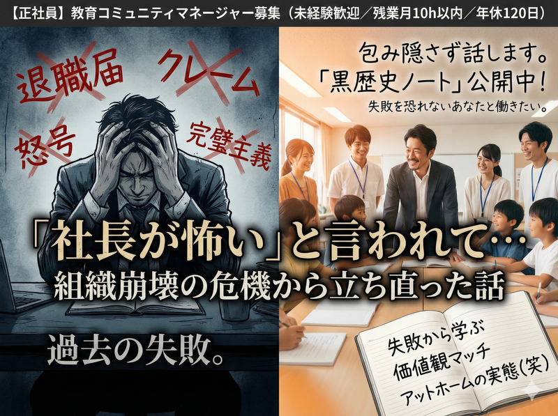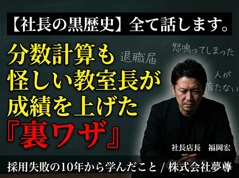 仕事内容 社長の黒歴史ノート ー 採用で失敗し続けた10年間の記録 株式会社夢尊 代表取締役 福岡 宏 はじめに 私は採用において、 数え切れないほどの 失敗をしてきました。 この連載では、 その中でも特に痛烈だった 失敗を正直に語ります。 成功談ではなく、失敗談。 これが私たちの等身大の姿です。 第1話:優秀な人材という幻想 (2018年4月) 大手進学塾から30歳の ベテラン講師を引き抜きました。 年収を100万円上げ、 幹部候補として迎えた彼は、 1ヶ月で退職しました。 「福岡さん、ここは僕が 思っていた環境と違います」 退職届を前に、 私は言葉を失いました。 彼が求めていたのは 「確立されたシステム」でしたが、 当社には「自分で作る裁量」 しかありませんでした。 学んだこと:優秀さは相対的です。 大手で優秀な人が、 中小企業で活躍できるとは 限りません。 採用で見るべきは 「スペック」ではなく、 「価値観の一致」でした。 第2話:感情に任せて 社員を怒鳴った(2019年9月) 保護者からのクレーム対応を ミスした社員を、 他のスタッフの前で叱責しました。 「何度同じミスをするんだ!」 その社員は翌日から休職し、 2週間後に退職しました。 他の社員からは「社長が怖い」 という声が人事に届きました。 学んだこと: 感情的なマネジメントは、 1人を失うだけでなく、 残った社員の信頼も失います。 今は「なぜそうなったか」を 一緒に考える時間を作っています。 第3話:アットホームという言葉で 応募者を失った(2020年6月) 求人広告に 「アットホームな職場」 と書きました。 応募は来ましたが、 面接で必ず聞かれました。 「アットホームって具体的に どういうことですか?」 私は答えられませんでした。 結果、その年の採用は 2名の予定に対して0名でした。 学んだこと:抽象的な言葉は、 何も伝えていないのと同じです。 今は「月1回、 社員が企画する食事会があります」 「困ったときは部署を超えて 助け合うルールがあります」 と具体的に書いています。 第4話:完璧を求めすぎて 人が育たなかった(2021年3月) 新卒社員に対して、 細かくチェックしすぎました。 授業準備、保護者対応、事務処理、 すべてに私の承認が必要でした。 3ヶ月後、彼女は言いました。 「自分で考える機会がなくて、 成長している実感がありません」 学んだこと:完璧を求めることは、 相手の成長機会を 奪うことでした。 今は「7割できたらOK」 というルールで、 失敗から学ぶ文化を作っています。 おわりに これらの失敗を経て、私は 「スタイルマッチ採用」に たどり着きました。 スペックではなく、価値観。 完璧ではなく、成長意欲。 もしあなたが 「失敗を開示する会社」に 興味を持ったなら、 それは私たちとの スタイルマッチの 第一歩かもしれません。 完璧な会社ではありません。 でも、誠実に向き合う会社です。 次回予告: 社員が語る 「夢尊で働く本当のところ」 良いことも悪いことも全部話します
