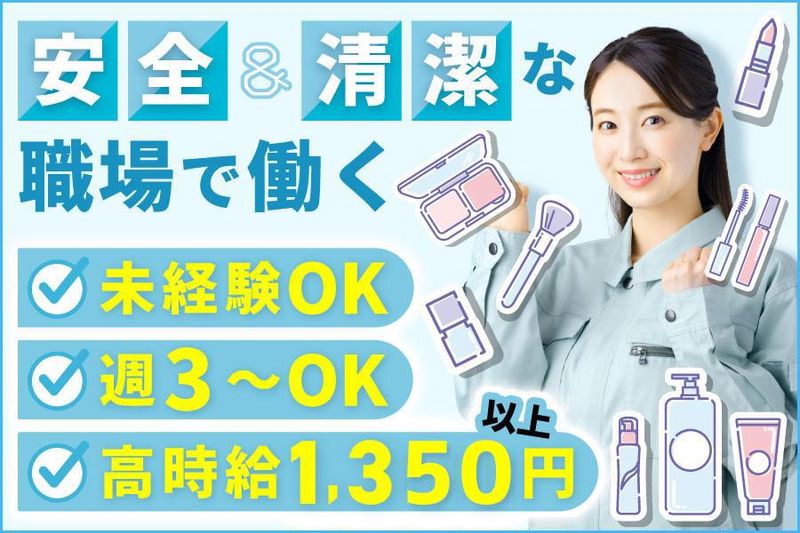 仕事内容 <花王の工場内での軽作業> ・化粧品の容器洗浄や供給 ・包装箱の組み立て、梱包・計量・検査など ほとんどが手作業で短期間で覚えられます。