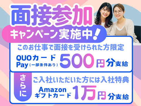 【保険制度】 雇用保険、労災保険、健康保険、厚生年金 待遇・福利厚生 【福利厚生】 ・各種社会保険完備 ・服装自由(デニム、スニーカーなどOK) ・髪型、髪色自由 ・ピアスOK ・ネイルOK ・ひげOK ・定期健康診断(年1回) ・au/UQスマホ従業員向け特典 ・スタッフ特典の福利厚生あり(旅行やショッピング、グルメ、映画などが割引料金で利用できます) ・きれいな休憩室完備(冷蔵庫、電子レンジ、自販機、無料Wi-Fi、ドレッサー、マッサージチェアあり) ・無料ドリンクサーバーあり(お茶、コーヒー、スープが無料で飲めます) ・自転車通勤OK ・駐輪場代規定支給(100円/日) ⭐入社特典あり⭐ Amazonギフトカード1万円分プレゼント♪ ( 支給条件 ) ◇入社翌月末まで在籍かつ翌月以降も勤務継続の方 ◇入社から翌月末までの出勤率90%以上 ⭐面接参加キャンペーン実施中⭐ 面接にご参加いただいた方に、 QUOカードPay500円分をプレゼント! ( 支給条件 ) ◇QUOカードはコードでのお渡しです。 ◇過去1年以内にアルティウスリンクで 面接を受けた方は対象外です。 ◇採用予定数の上限に達し次第、 本キャンペーンは終了いたします。 ◇QUOカードPayは面接の翌日以降 (3営業日以内)にメール配信します。 ※Amazonギフトカードはコードでのお渡しとなります ※Amazonギフトカードは入社の翌月に配布致します ※他キャンペーンとの併用はできません ※本キャンペーンはIndeedによる提供ではなくアルティウスリンク株式会社よる提供です 本キャンペーンについてのお問合せはAmazonではお受けしておりません アルティウスリンクキャンペーン事務局(0120-925-331)までお願い致します Amazon、Amazon.com.jpおよびそれらのロゴはAmazon.com.Inc.またはその関連会社の商標です