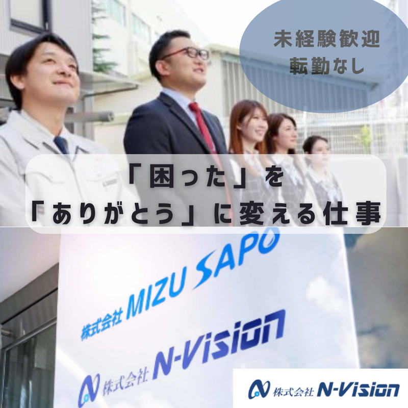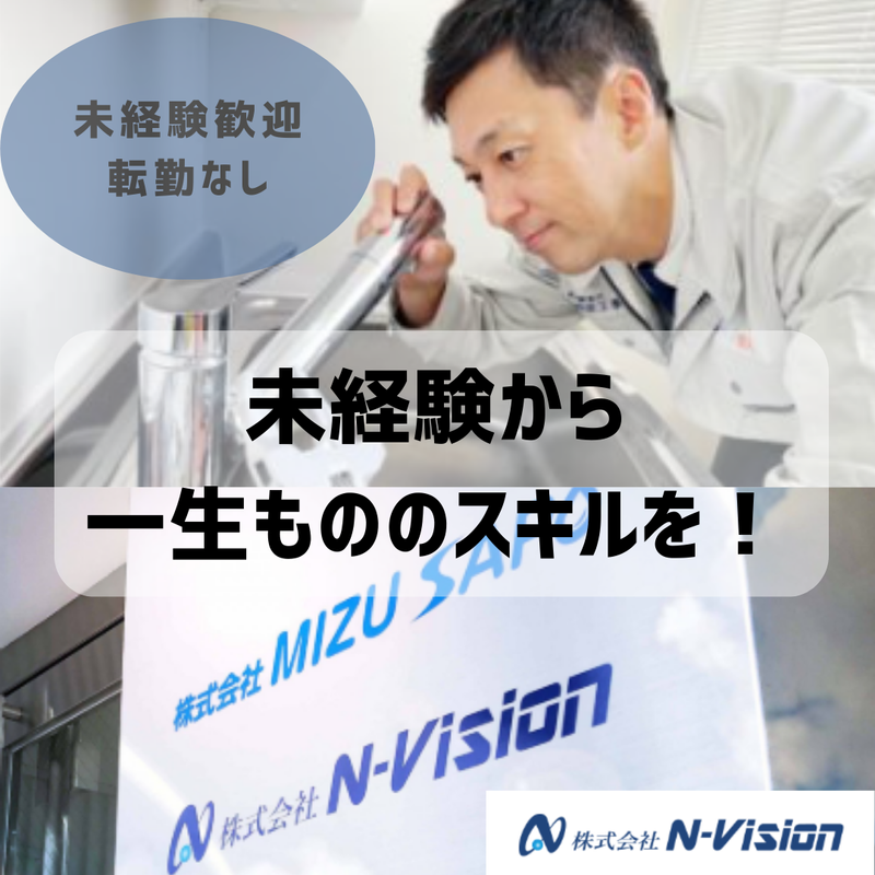 求めている人材 年齢・学歴・経験は一切不問! 「やってみたい」その気持ちが応募資格です。 【こんな方、大歓迎】 ・20代の若手から、キャリアチェンジを目指す30代・40代、まだまだ活躍したい50代・60代の中高年・シニア層まで、幅広く歓迎します。 ・未経験から成長したい方 ・向上心を持って仕事に取り組める方 ・自分の可能性を広げたい方 【手に職をつけて働きたいあなた】 ・コツコツと仕事を進めるのが好き ・働きやすい環境で腰を据えて仕事したい ・効率よく業務に取り組みたい ・細かい作業や手先の器用さに自信がある ・集中力が自分の武器! ・物を作ったり修理する作業が得意 ・モノづくりが趣味 ・まずは自分でやってみたい アナタのスタンスを当社は応援します! 【HPでも当社の魅力を知ってください】 まずHPをご覧いただければ、 当社で働くイメージが湧いてくると思います。 では、当社はどんな会社なのか。 それを知っていただくために、ぜひ 「株式会社N-Vision」で検索してください。 当社の企業理念や代表の思い、 サステナビリティへの取り組みなど、 より当社の事をわかって頂けると思います。 京都営業所HP https://kyoto-mizu-sapo.com