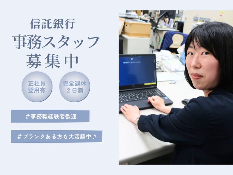 仕事内容 ┈┈┈┈┈┈◦✩◦┈┈┈┈┈┈ ✅プライベートも大切にできる✅ ✦:フォロー体制充実! ✦:正社員登用制度あり(条件あり) ✦:事務経験者さんに人気のお仕事 ┈┈┈┈┈┈┈┈┈┈┈┈┈┈┈┈ ▶▶【人気の事務ワーク】◀◀ ・:・:・:・:・:・:・:・:・:・:・:・:・:・:・:・ 銀行関連の事務業務をお任せします。 三井住友信託銀行 大阪本店営業部からの依頼で行う 入力業務や事務等に関する銀行事務全般です。 (本店営業部の隣のフロアです) ※下記業務内容は一例です。 具体的には… ✅電話応対 ✅書類の受付、発送 ✅書類内容のチェック ✅専用端末へのデータ入力 ✅預金為替業務・出納業務等 ✅その他、付随する事務業務 ※営業・セールス一切ありません! ▽POINT:未経験OK!!▽ ✮ 賞与&昇給あり ✮ 土日祝休み ✮ 年1回9連休取得可(土日含む) ✮ マニュアルあり ✮ 子育て世代の方活躍中 ▶▶【専門知識は不要です】◀◀ ・:・:・:・:・:・:・:・:・:・:・:・:・:・:・:・ 「銀行事務は難しそう…」 そんな心配は一切不要! 金融の知識がなくても、 PC入力と電話対応ができればOK! 業務ごとのマニュアルが整っており、 書類チェックなども一つひとつ丁寧に指導。 未経験の方でも、 安心してスタートできます◎ もちろん、 事務経験をお持ちの方は これまでのスキルを活かせますよ! ▶▶【安心のフォロー体制】◀◀ ・:・:・:・:・:・:・:・:・:・:・:・:・:・:・:・ 各種手続きマニュアルに加え、 困った時はすぐに相談できる 専任の教育担当がしっかりサポート。 「分からないまま進む」ことはなく、 安心して業務に取り組める環境です。 ▶▶【入社後の流れ】◀◀ ・:・:・:・:・:・:・:・:・:・:・:・:・:・:・:・ ❯❯❯❯ 入社 入社手続き・研修後、配属先へ。 ❯❯❯❯ 翌日〜 先輩のマンツーマン指導のもと、 データ入力やチェックなど 簡単な業務からスタート。 ❯❯❯❯ 2〜3ヶ月後 業務に慣れてきたら電話応対も担当。 内容を理解した上で対応できるので安心です。 ❯❯❯❯ 半年〜1年後 修得チェックリストをクリアすれば独り立ち。 先輩のフォローを受けながら、 自分のペースでスキルアップできます。 / ⭐先輩スタッフの声⭐ 入社5年目/38歳(契約社員) \ 別業界で事務をしていましたが、 ライフスタイルの変化で 一度仕事を離れました。 その後子育てが落ち着き、 契約社員としてこちらに入社しました。 職場は優しくて面倒見の良い方ばかり。 チームで助け合う雰囲気があり、 とても働きやすい環境です。 正確さや丁寧さは求められますが、 先輩が必ず一緒に確認してくれるので、 不安なく仕事を覚えることができました。 「家庭と両立できるか不安…」 そんな方も、 お互いにフォローし合える職場なので 安心して働けると思います。 一緒に働けるのを楽しみにしています!