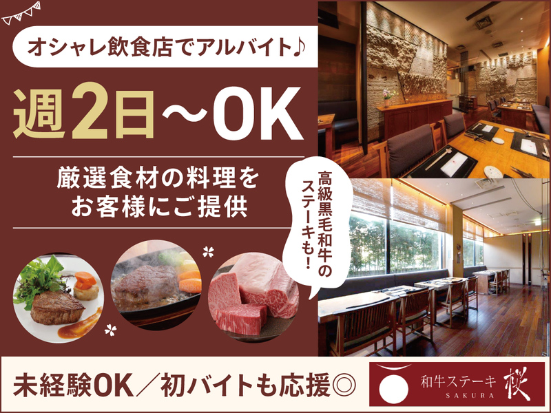 仕事内容 \バイトデビュー応援!/ 【 土日祝いずれか含む週3日~OK! 】 《お肉好き必見》黒毛和牛の厳選ステーキが 焼ける贅沢な香り溢れるキッチンでのお仕事 *まかないあり!お肉好きな方も大歓迎! *学生活躍中!学業との両立も可能です! 「 学校が休みの土日メインに働きたい 」 「 学校ある日はサクッと休みはがっつり 」 …など働き方は気軽にご相談くださいね。 -・-・・-・-・・-・-・・-・- <仕事内容> シックな雰囲気の和牛ステーキ店での ホールスタッフをお任せします。 ( 具体的には… ) 〇接客・レジ 〇席へのご案内 〇料理の提供 など 《 バイトデビューも応援 》 仕事は一つずつ丁寧に教えていきます。 マニュアルがあるので、 安心してスタートできる環境です! できることを少しずつ増やしていきましょう -・-・・-・-・・-・-・・-・- 【 和牛ステーキ 桜 】 A4・A5ランクの黒毛和牛、有機野菜 など厳選した食材を使った料理で 「贅沢なひと時」をご提供するお店。 誕生日や記念日といった 「特別な日」に来店されるお客様も 多いお店です。 オシャレ空間で働きたい方や、 落ち着いた雰囲気のお店で働きたい 方にもオススメですよ。 【HP】https://www.steak-sakura.net/