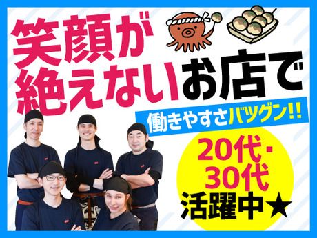 職場環境 【従業員構成】 周りのSTAFFや社員さんが声をかけてくれたり、 笑顔が絶えないお店で働きやすさバツグン! 総勢30名前後のアルバイトスタッフが在籍中! 短大生・大学生・専門学生・主婦パート・ フリーター・Wワーク社会人など、 20代・30代・40代活躍中! ↓働いた感想♪ 「正社員になりたいと思える位気に入った◎」 「たこ焼きも焼けるって、レアで楽しい♪」 「学校授業、部活、サークル、遊び、就活など 本当に色んな事と両立できてる!」 「最初はスキマバイト的な感じで始めたけど、 今はフルタイム勤務で稼いでます!」などなど <応募理由は何でもOK> ・好きな時間に働きたい ・たこ焼きやお酒が好き ・楽しい事が好き ・珍しいバイトしてみたい ・家が近い …ご応募お待ちしています♪