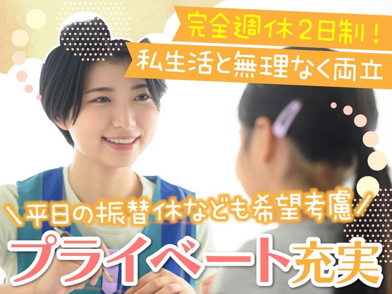 求めている人材 【必須条件】 ・放課後児童支援員資格をお持ちの方 ▼下記の資格・ご経験をお持ちの方も ご相談ください ・保育士 ・社会福祉士 ・教員免許(小学校・中学校・高校・幼稚園) ・大学または大学院にて、社会福祉学・教育学 などの当課程を修了された方 ・該当する学科の単位を修得し、大学院への 入学が認められている方 ・高卒以上相当の学歴があり、 2年以上の学童保育での実務経験があり、 市町村長の認可を受けている方 ※放課後児童支援員資格をお持ちでない場合も、入社後に資格取得を目指していただけます ※資格取得研修の受講料は会社が負担します 教育施設・児童福祉施設、または同等の施設での実務経験が5年以上ある方は、主任ポジションとしてのご活躍も可能です。 管理職の経験が2年以上ある方も歓迎! - 子どもたちの成長を見守るだけでなく、スタッフ同士で協力しながら、より良い施設づくりを目指せる方をお待ちしています! 【こんな方にピッタリ!】 ・コミュニケーションを取りながら働ける方 ・楽しみながら環境づくりに取り組める方 ・子どもやスタッフに寄り添える方 ・仕事と私生活のバランスを大切に働きたい方 ・現場を支える役割に挑戦したい方 - 【スタッフさんの声】 幅広い年代のスタッフが活躍中! 職場の雰囲気や働きやすさについて、現場の声をご紹介します。 ■協力し合える、あたたかい職場です 年齢に関係なく前向きな人が多く、 会議でも『もっと良くしよう』という 意見が自然と出てきます。 チームで施設をつくっている実感があります。 (入社6年目/51歳) ■年齢を気にせず、経験を活かせます この年齢でも必要としてもらえるのが嬉しいですね。 昔遊びを教えたり、これまでの経験が 子どもたちに喜ばれる場面も多く、 やりがいを感じています。 (入社4年目/68歳) ■私生活と無理なく両立できています 完全週休2日制で、お休みの相談もしやすい環境です。 仕事とプライベートのバランスが取りやすく、長く続けられています! (入社2年目/20歳)
