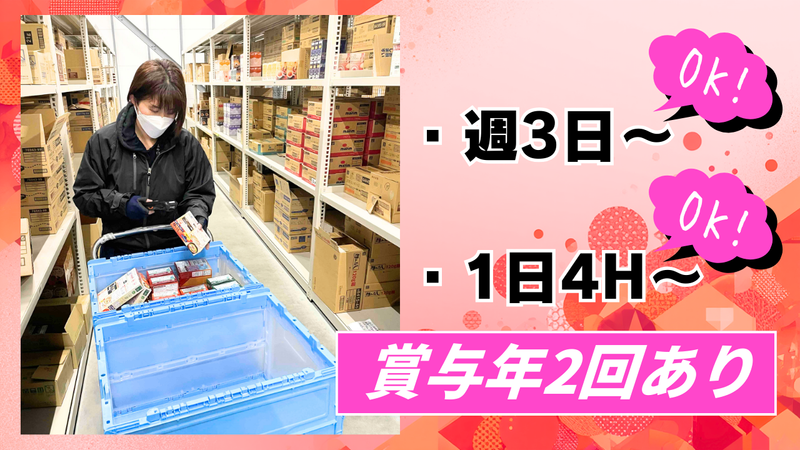仕事内容 =============== 新規事業開始による増員! =============== ✅フォークリフトの資格を お持ちの方も大歓迎! コンビニやスーパーでよく目にする 皆さんお馴染みの食品 カップラーメン・飲料・カレー ビール・砂糖などの 商品入出荷・検品作業のお仕事! <⭐働きやすい環境> ✅土日祝休みもOK。 週3日~5日 出勤日も柔軟に対応。 ■07:30~19:00内でのシフト制 例)7:30~12:00、13:00~19:00 9:30~17:00、 9:00~16:00 希望に応じて柔軟に対応致します◎ <⭐給与も充実> ✅年一回定期昇給(4月) 勤続年数・個人評価によって 大幅な時給UPも可能 ✅夏冬賞与(7月・12月)有 支給実績 2025年間 2.5か月 更に業績により臨時ボーナスあり <シンプルな作業が中心!> ハンディターミナルを使用しますので 商品の置いてある場所や出荷数量などは 全て表示されます。 <物流・倉庫作業が初めての方も大歓迎!> ・商品は普段目にする食品ですので すぐに業務に慣れて頂けます。 ・ハンディターミナルの使用方法も 丁寧に指導しますのでご安心ください。 20代~60代まで初めての方も活躍中! ※フォークリフト資格をお持ちの方は リフト作業もお任せします。 <主な仕事内容 1日の流れ> ・午前(7:30~12:00) 入荷業務:商品のストック作業 (ケース品のラックへのストック作業) 出荷業務:ピッキング作業 (ケース品・バラ品のカートラックへの オリコンを使用した積込作業) ・午後(13:00~19:00) 出荷業務: ピッキング作業 (ケース品・バラ品のカートラックへの オリコンを使用した積込作業) 片づけ作業 (段ボール廃棄・商品ストック 物流備品の片づけ) ※繁忙期(5月・8月・12月)中は 入出荷量が増える為残業あり (1時間~2時間程度) ※残業が発生する場合は個別に 相談させて頂きます。