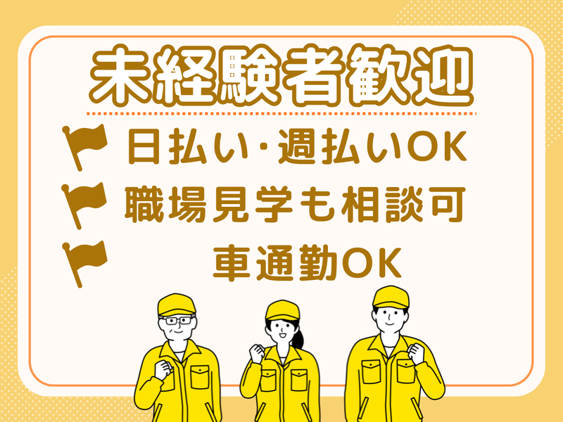 【保険制度】 雇用保険、労災保険、健康保険、厚生年金 待遇・福利厚生 【福利厚生】 ◆交通費支給(規定) ◆社会保険完備 ◆日払い可(規定) ◆週払い可(規定) ◆寮応相談 ◆車通勤OK ◆自転車通勤OK ◆駐車場あり ◆駐輪場あり