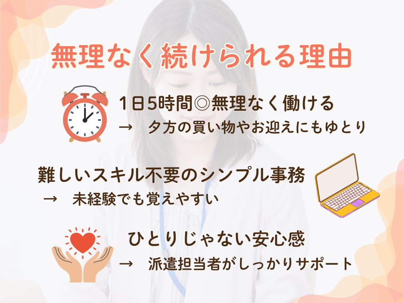 求めている人材 \こんな方におすすめ/ ・短時間で無理なく働きたい方 ・子育てや家庭と両立したい方 ・ブランクがあり、久しぶりに仕事復帰したい方 ・未経験から事務にチャレンジしたい方 ■資格:不問 ■経験:不問 ※経験者も大歓迎! ■PCスキル:基本操作 ■普通自動車運転免許必須(AT限定可) ★未経験OK、もちろん事務経験のある方も歓迎♪