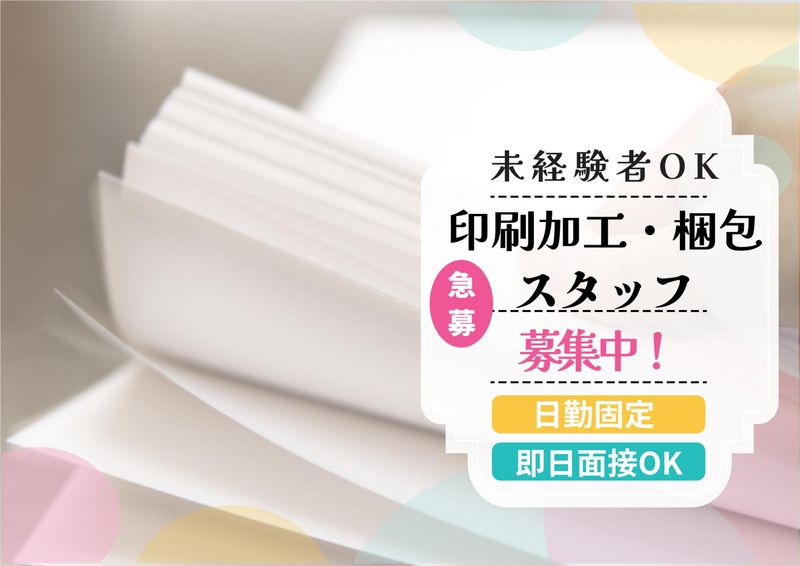 仕事内容 ✅仕事内容  ̄ ̄ ̄ ̄ ̄ ̄ ̄ ̄ ̄ ̄ ̄ ̄ ̄ ̄ ̄ ̄ ̄ 埼玉県本庄市にある工場での 加工や発送をする作業になります! ⭐ どんな製品?? ⭐ 名刺・パンフレット・チラシ・冊子等 皆さんが生活している中で よく目にする製品です! ⭐ どんな業務?? ⭐ ①加工 ・製本にする機械用紙をセット ・ボタンを押して製本 ・完成品を箱に詰める ②発送 ・製品をコンベアに乗せる ・ビニール包装された製品を パレット上の段ボールに詰める ①②の繰返し作業です♪ 1度覚えたら流れに沿って自分のペースで サクサク進められる内容です♪ 機械は紙を動かしやすいように 加工がされているので 一人でも楽に動かすことができます! ✅嬉しい「週払いOK」!!  ̄ ̄ ̄ ̄ ̄ ̄ ̄ ̄ ̄ ̄ ̄ ̄ ̄ ̄ ̄ ̄ ̄ 「転職のタイミングは 給与の振り込みが1カ月先・・・」 「急な出費が必要になった!!」 そんなときでも安心! 週払いOKなのでお金の心配をせずに 安心して働けます! ✅未経験者でも安心のサポート体制  ̄ ̄ ̄ ̄ ̄ ̄ ̄ ̄ ̄ ̄ ̄ ̄ ̄ ̄ ̄ ̄ ̄ 「機械の操作なんてしたことない...」 「製造業にチャレンジしたいけど不安...」 そんなあなたも大丈夫! 作業に慣れるまでは先輩スタッフさんが 丁寧にサポートをするので 未経験スタートでも安心♪ 同じ作業を行っているスタッフさんが 近くにいるので、わからないことは すぐに質問できます! ✅入社前の工場見学OK  ̄ ̄ ̄ ̄ ̄ ̄ ̄ ̄ ̄ ̄ ̄ ̄ ̄ ̄ ̄ ̄ ̄ 入社前に実際に働く現場を近くで 見学できるので、 入社後のギャップがなく定着率も◎ 「重いものを運んだりするのかな…」 「紙で指が切れたりしないかな…」 そんな不安や心配がある方は ぜひ一緒に見学しに行きましょう! 見学=入社ではないので 見学だけでもOKです! まずはお気軽お問い合わせください♪ ✅こんな人にオススメ  ̄ ̄ ̄ ̄ ̄ ̄ ̄ ̄ ̄ ̄ ̄ ̄ ̄ ̄ ̄ ̄ ̄ *製造業は未経験だけどチャレンジしてみたい人 *あまりコミュニケーションが得意でない人 *他人のペースに合わせることが苦手な人 ●こんな人が活躍中 <42歳女性独身 前職:スーパーのレジ> 接客業や職場の人間関係に疲れて 別の業界での転職を考えていました。 製造業は人とのコミュニケーションが 少なくて自分に向いてそうだなと思っていたけど、 業務がきつそう・ミスしたら怒られそうな イメージがあり、今までは避けていました。 ただこの仕事は、重労働が全くなく、 他の人の業務スピードに合わせる必要はないので、 自分のペースで働くことができます。 休憩も自分の好きなタイミングで取れるので、 良い意味で他の人に気を遣わない職場でオススメです♪